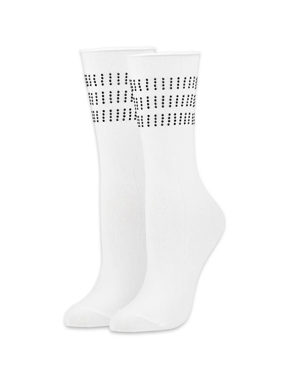 White socks with black crystals. Pair with your favorite sneakers or heels!