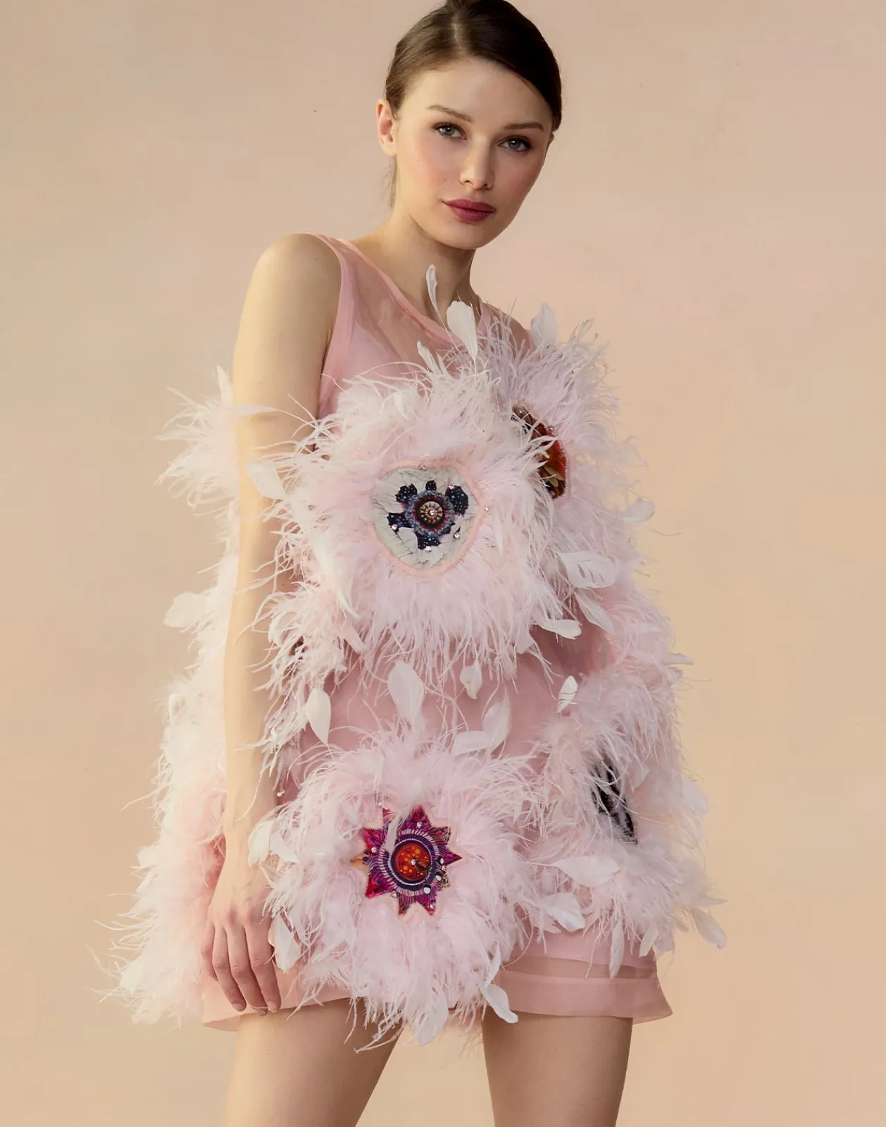 Care instructions: dry clean only””}’>Fabric content: 100% silk base, 100% ostrich feathers - <span data-mce-fragment="1" data-sheets-value='{"1":2,"2":"Feather mini skirt