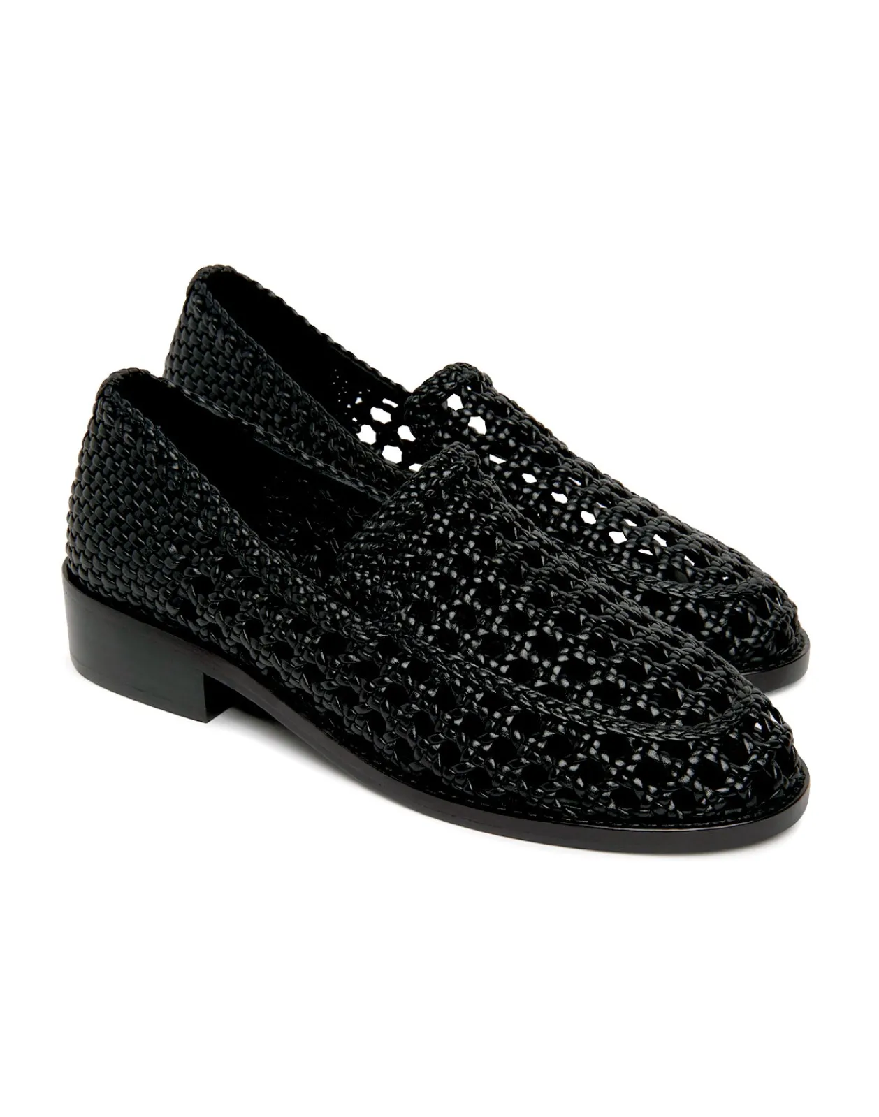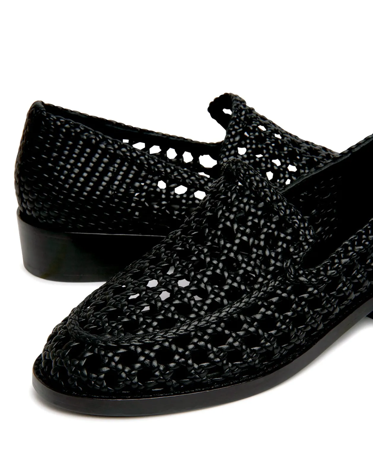 Black braided penny loafer. Rounded almond toeSlip-on constructionPadded leather footbedUpper: 100% LeatherOutsole: 100…