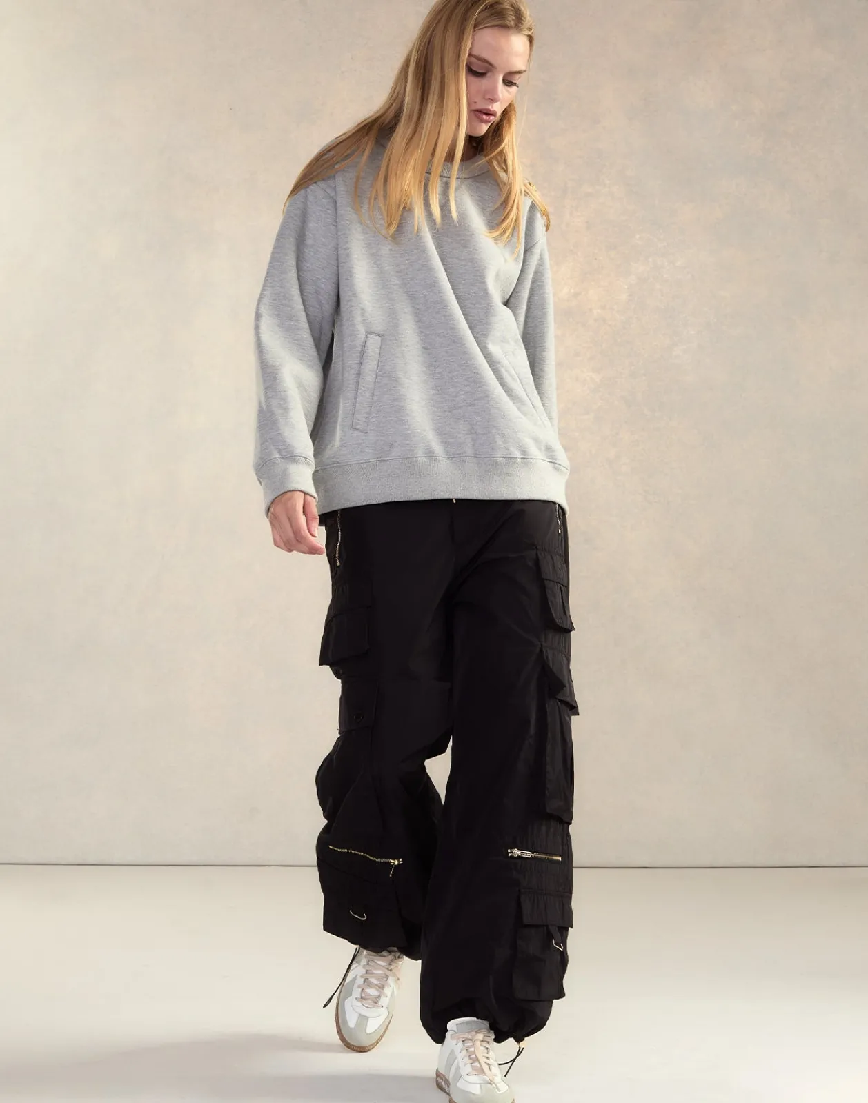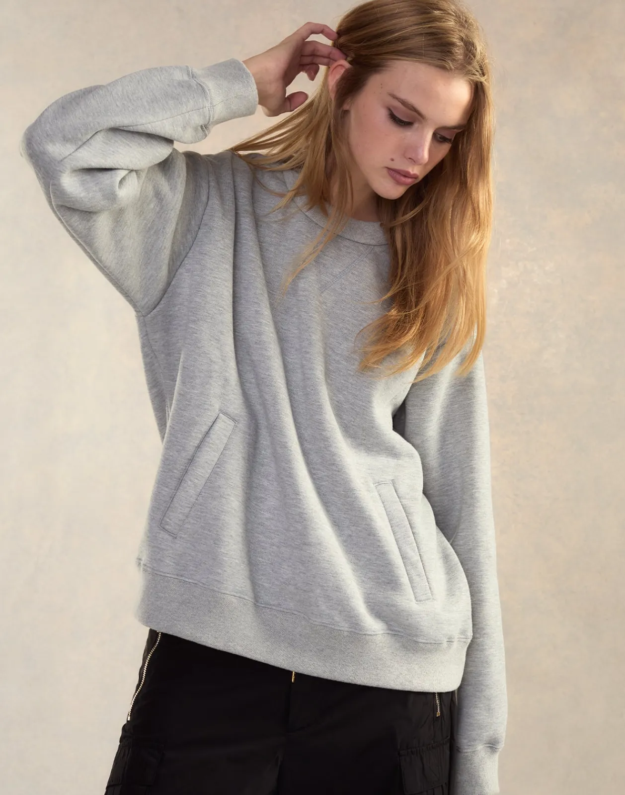 - Long sleeves with ribbed cuffs and hem