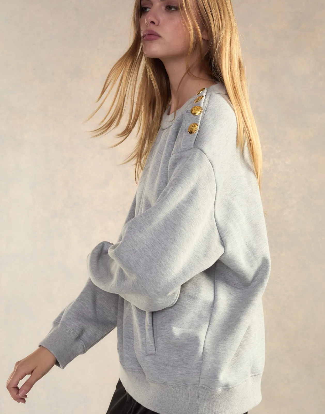 Heather grey crewneck sweatshirt with gold button details