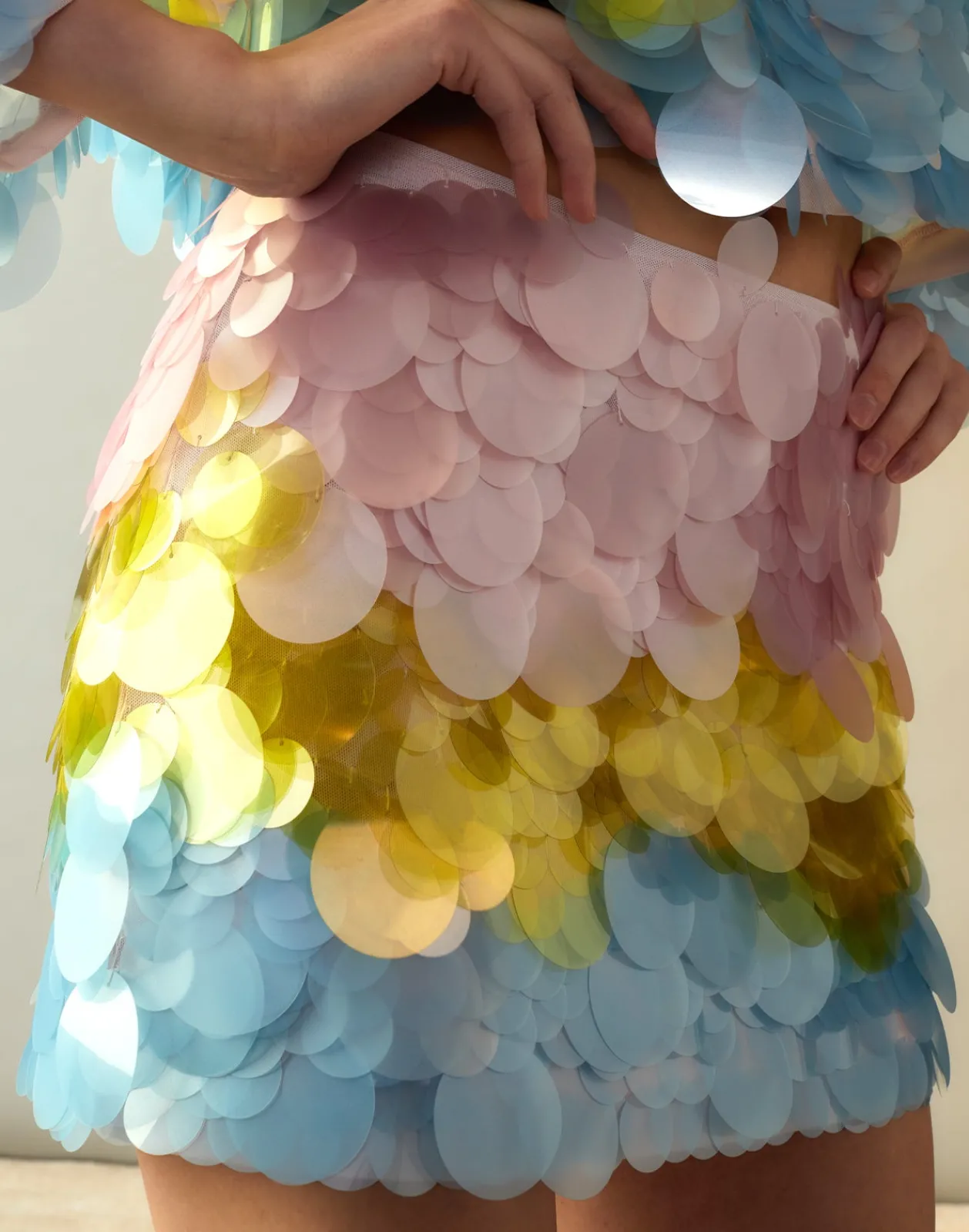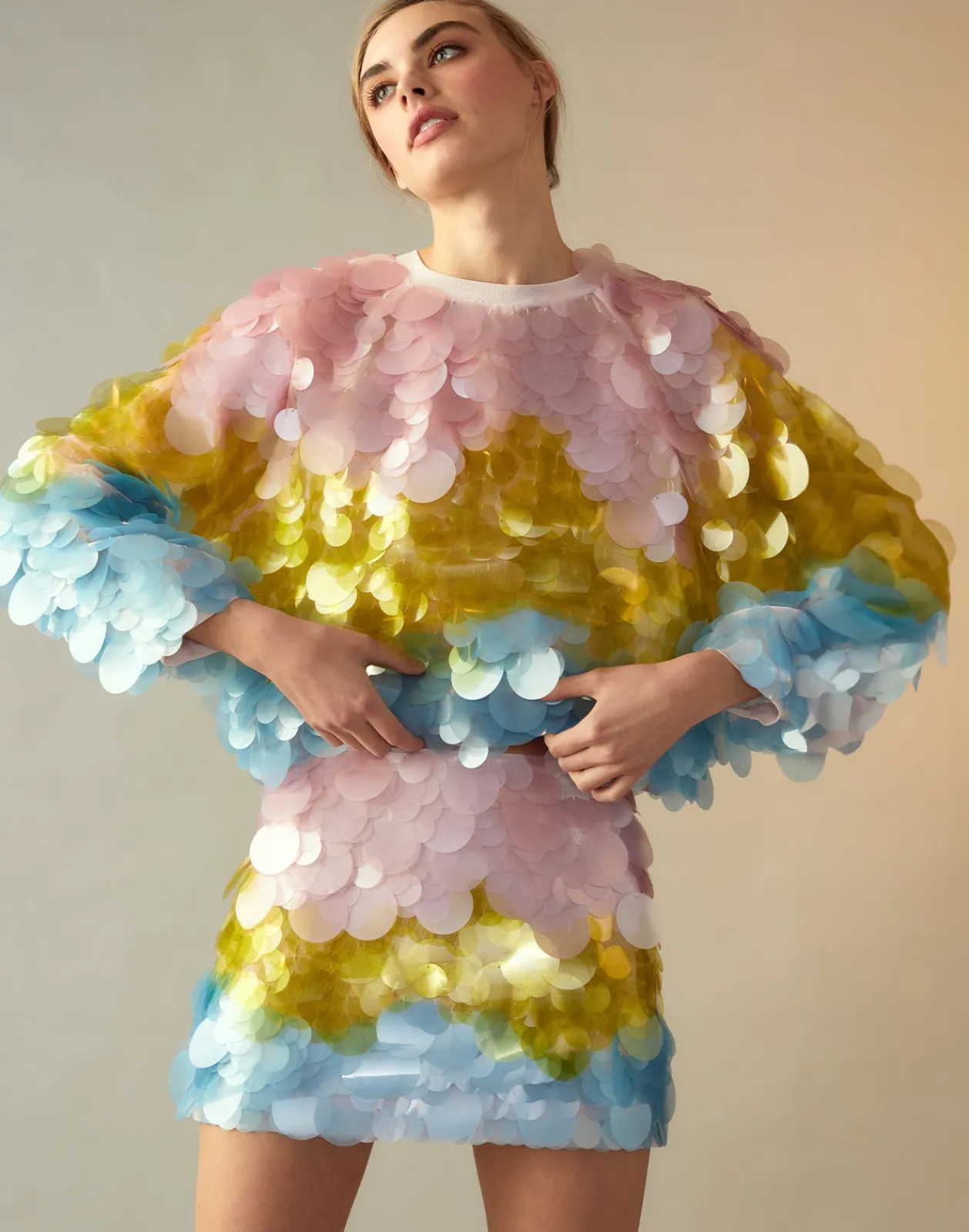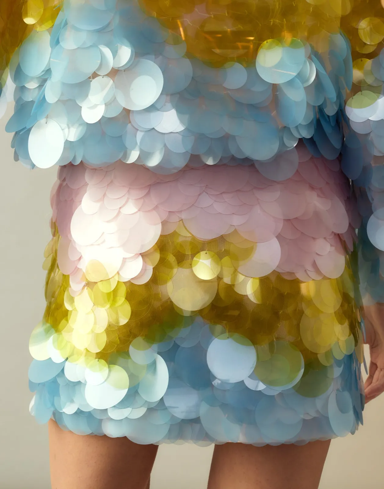 - Adorned in oversized pastel paillettes