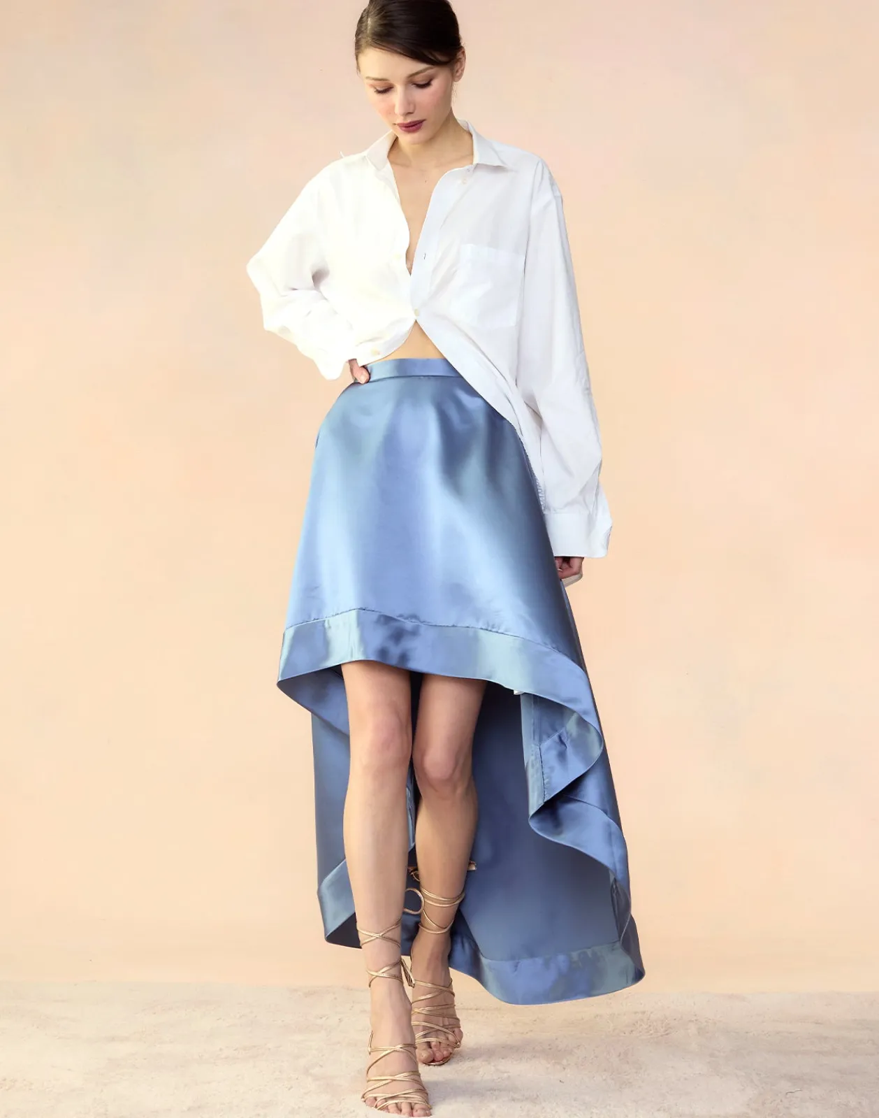 Smoky blue satin high low skirt.