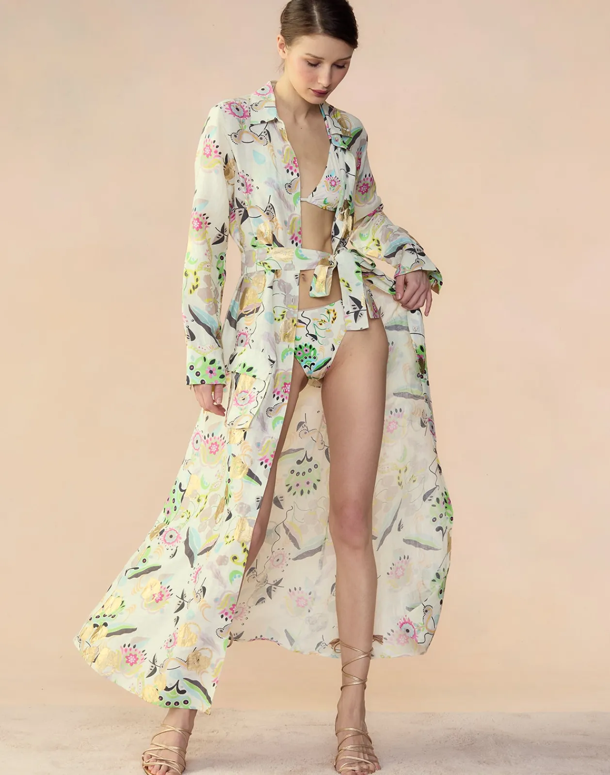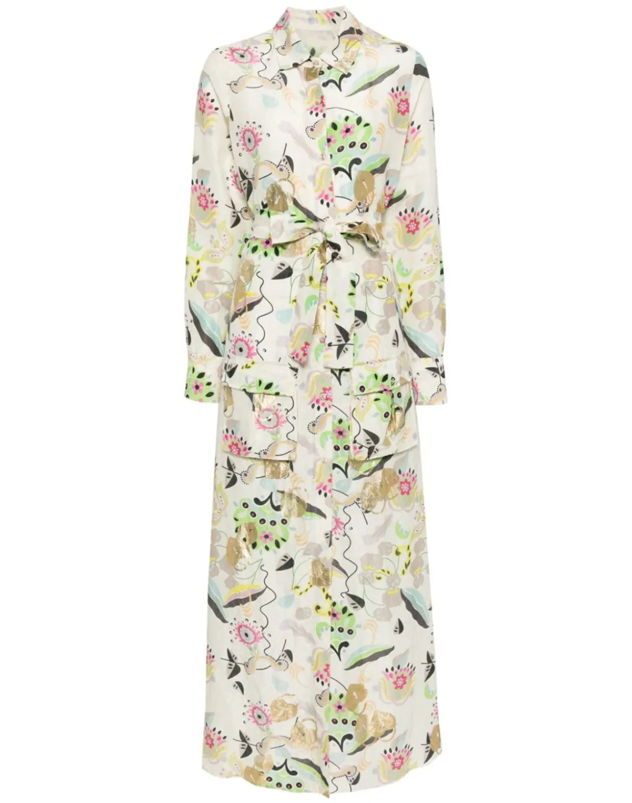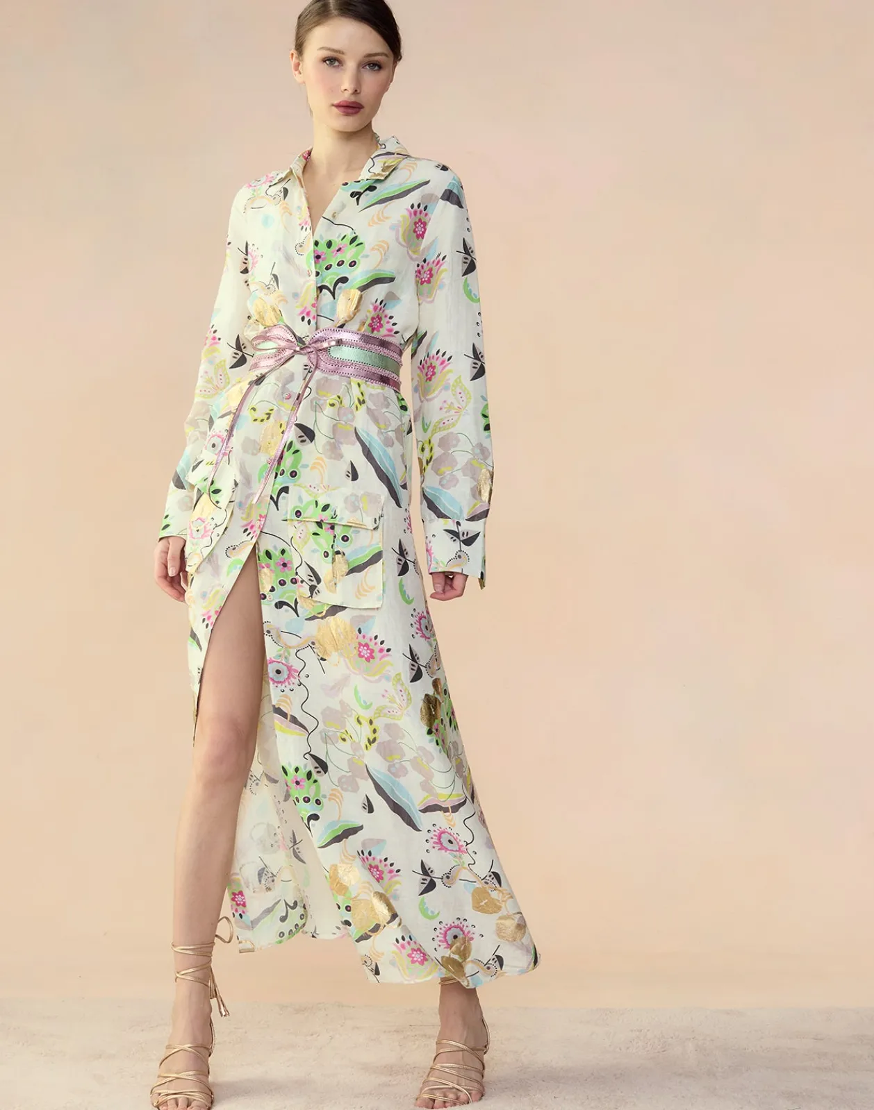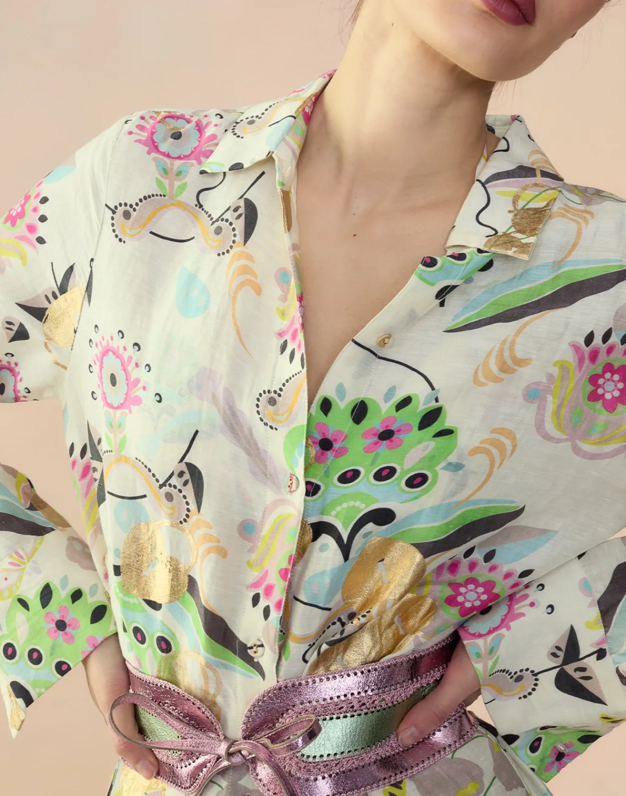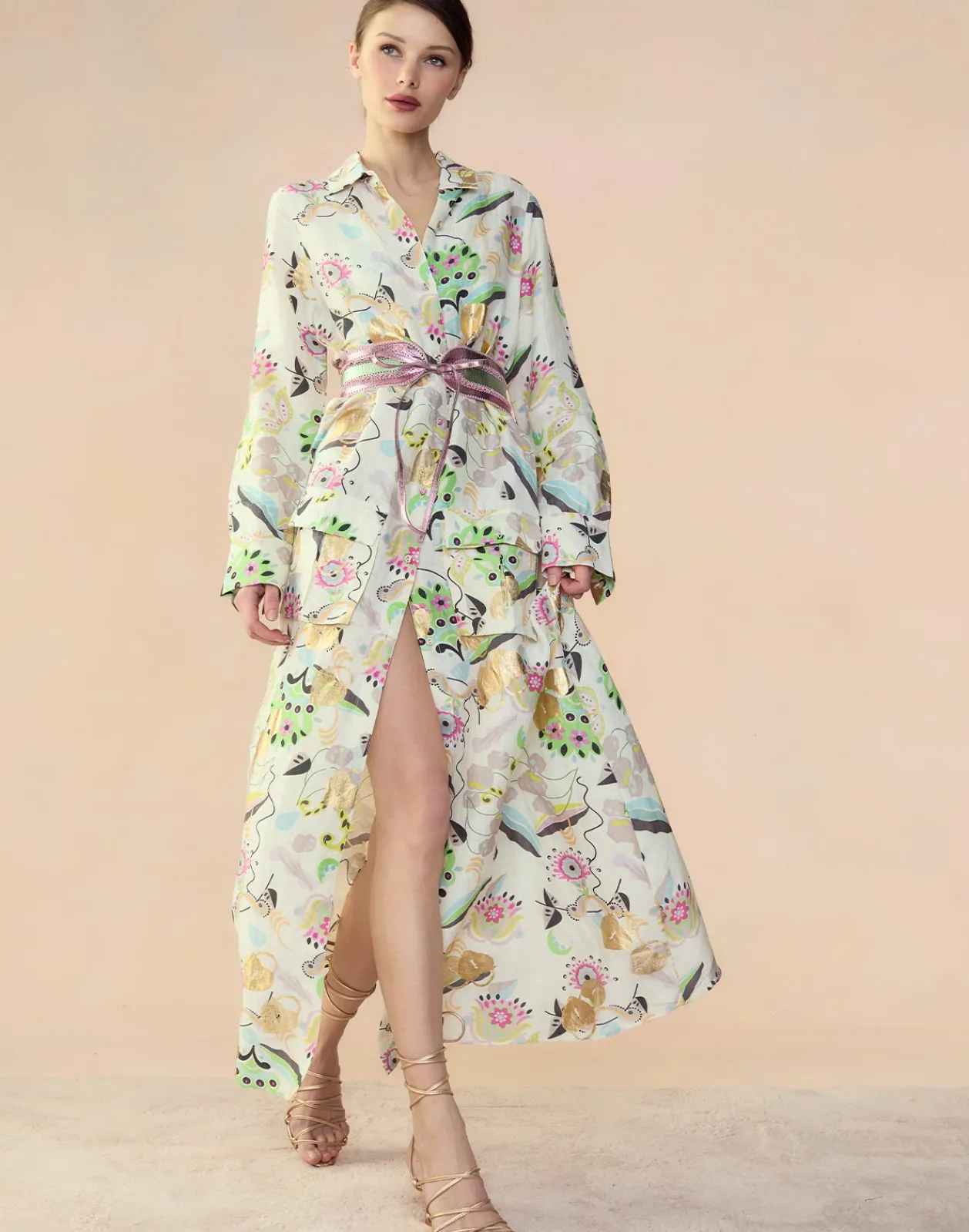 Love Locked linen and silk linen blend with gold foil shirt dress.