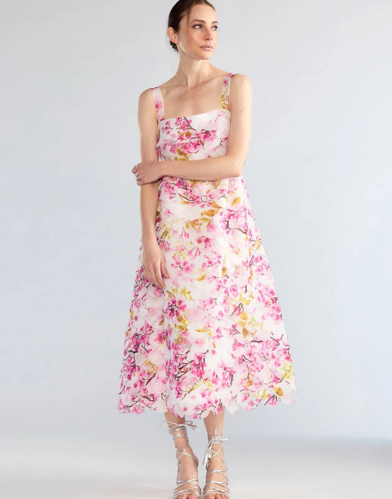 Cherry blossom printed organza scalloped midi dress