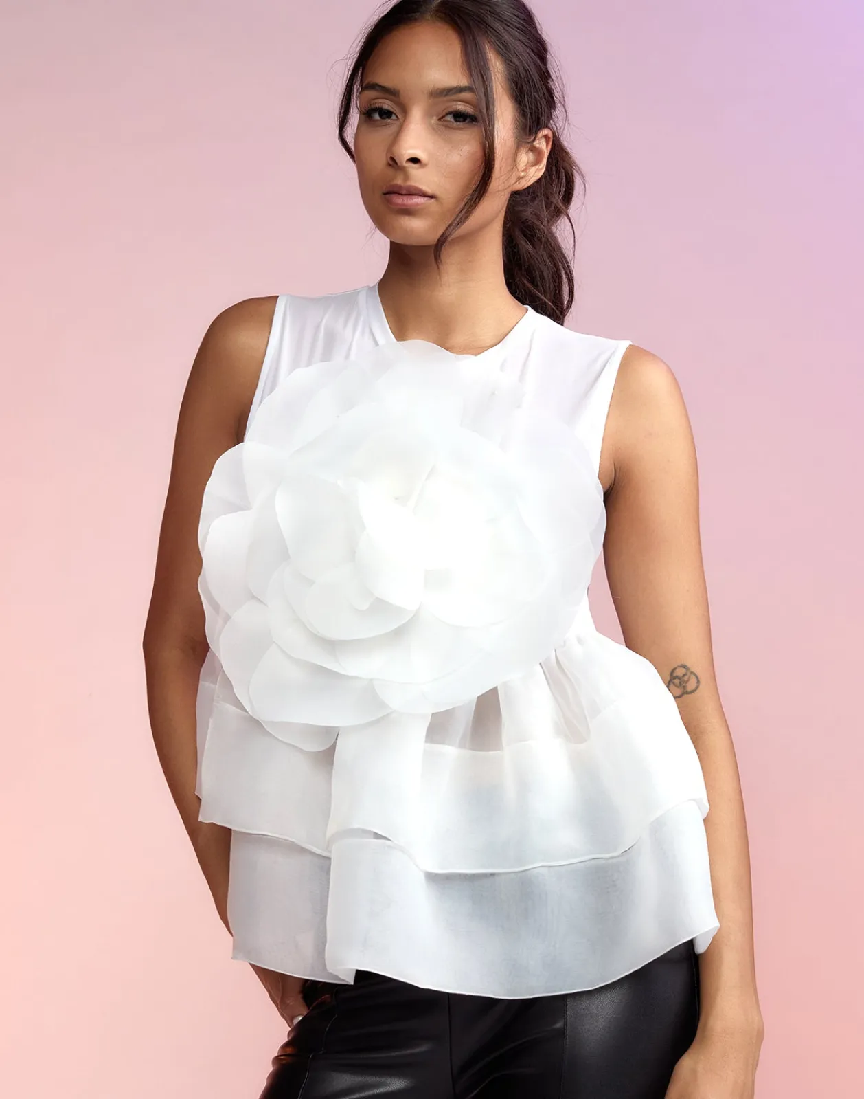 White organza mesh top with organza flower appliqué.