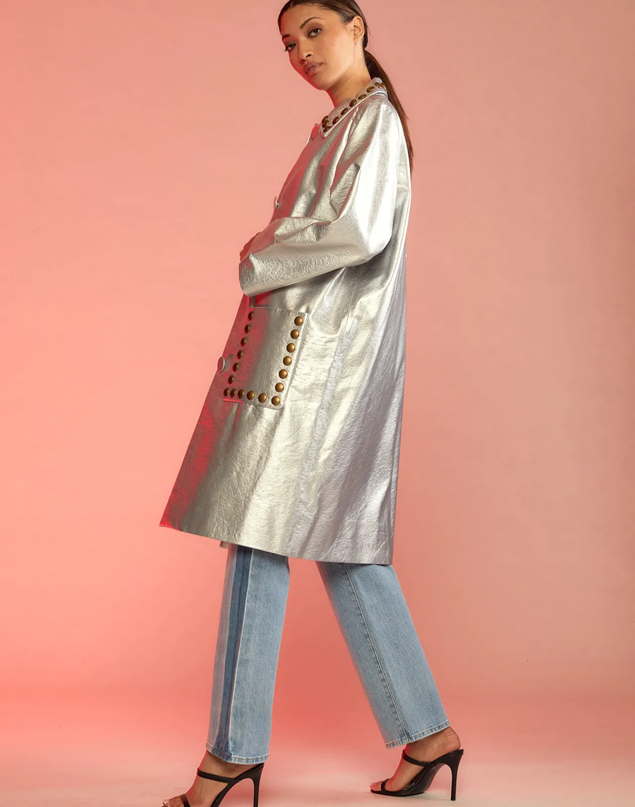 Metallic silver vegan leather studded coat.