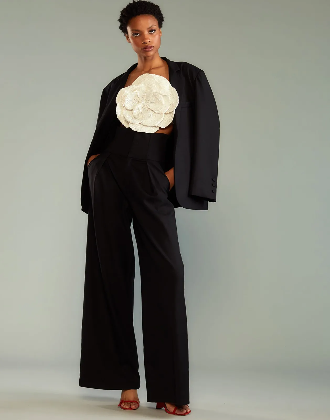 Complete the look: Corset Waist Pants, Sequin Flower Bandeau