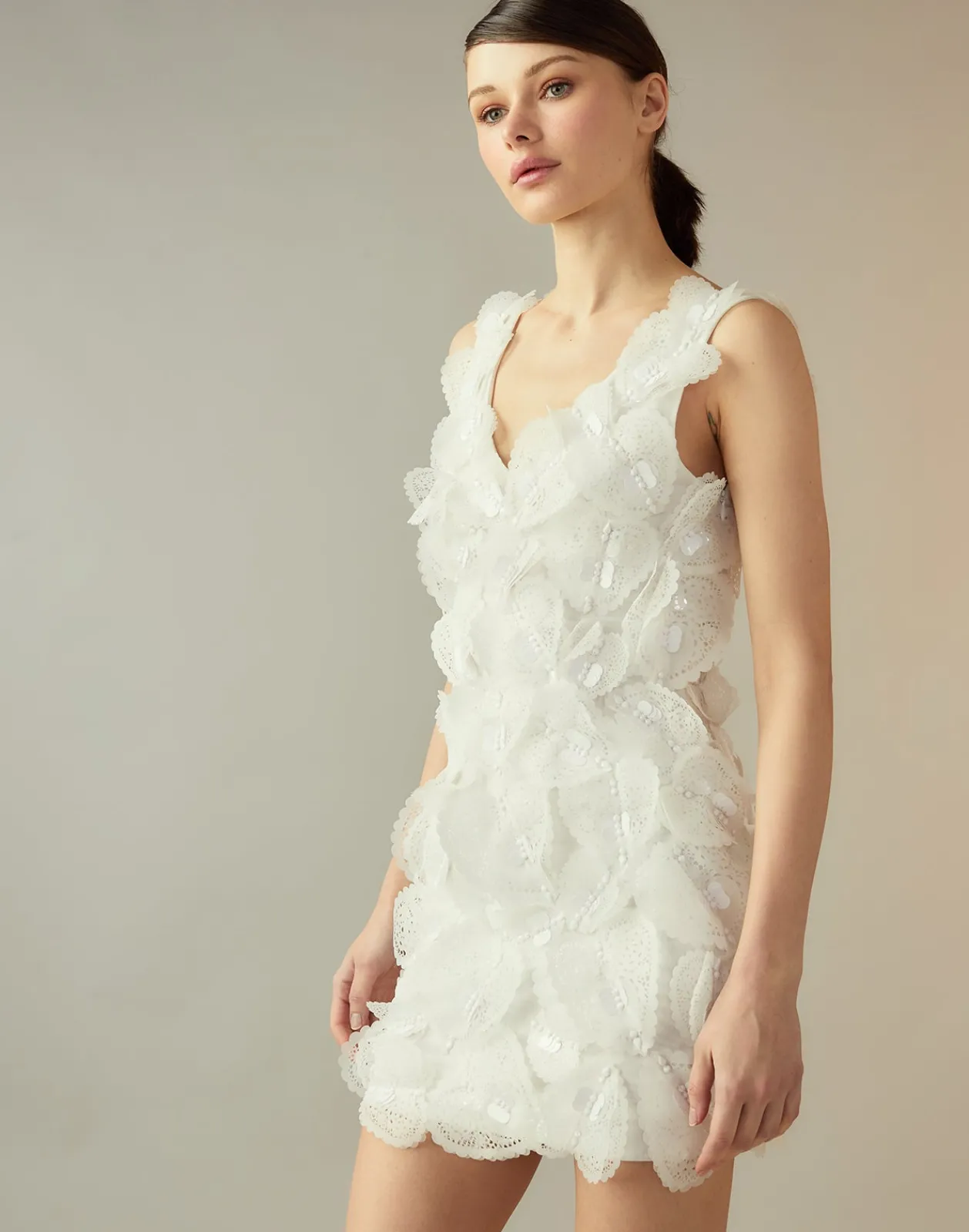 - Sleeveless cut with delicate scalloped edges
