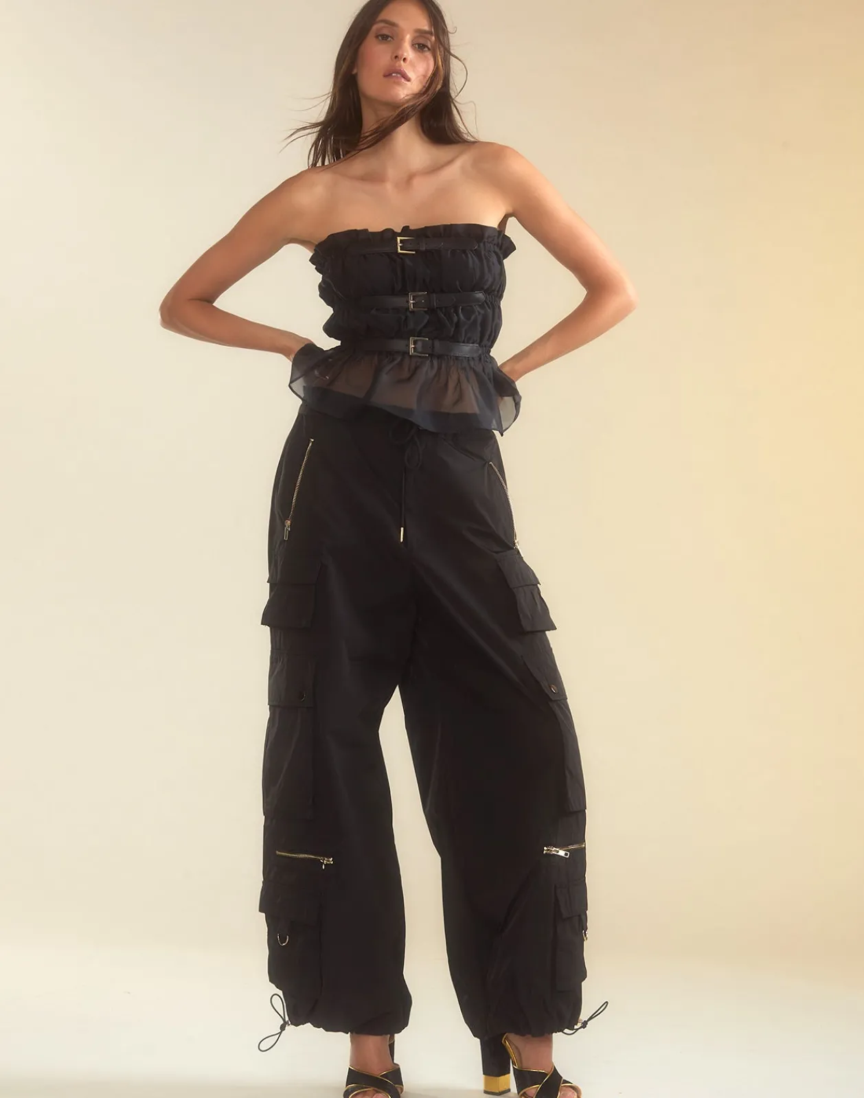 Black nylon cargo pants.