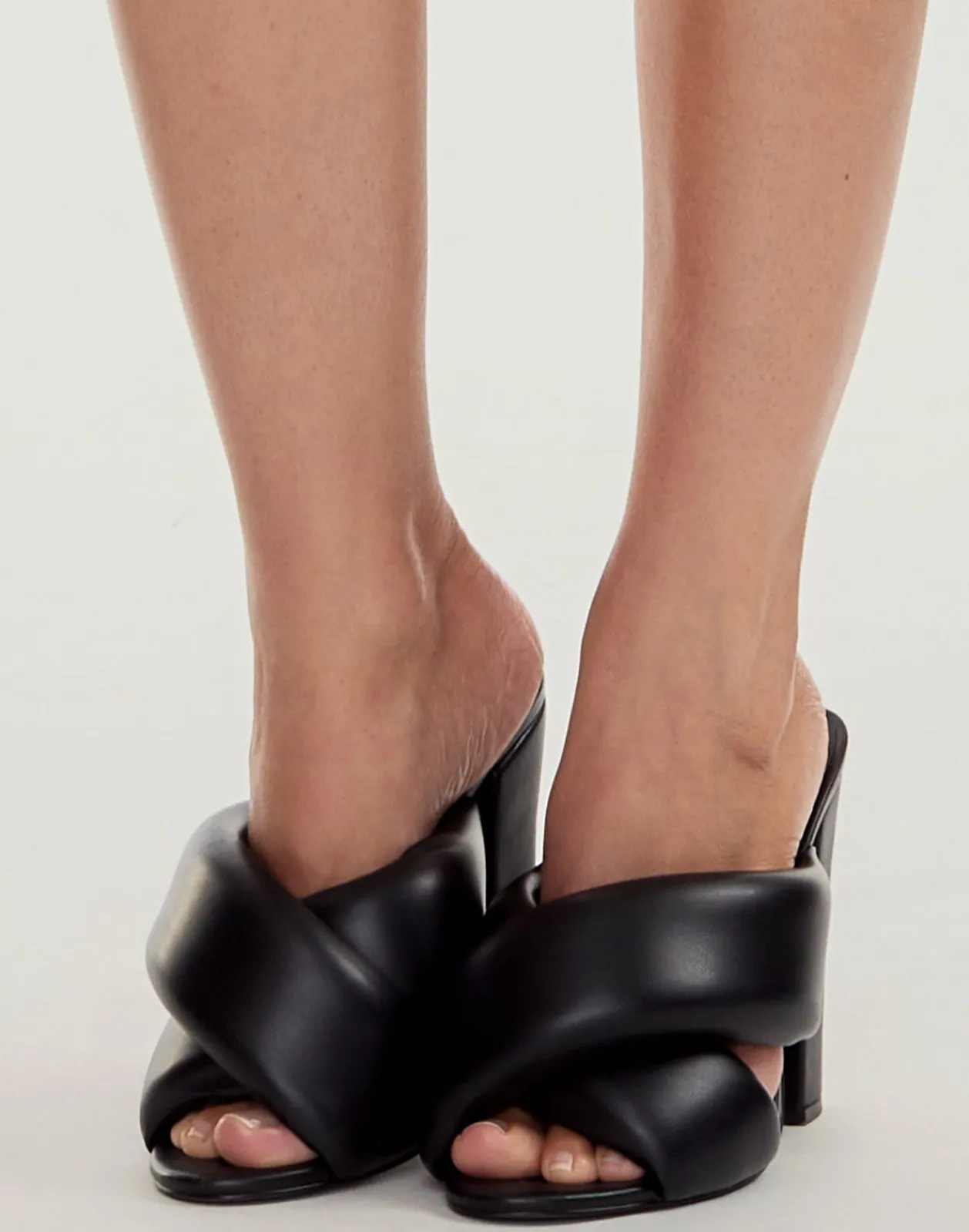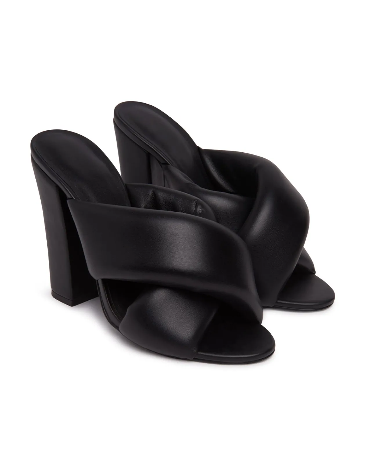 Crossed padded vegan leather mules Round open toeCrossed padded leather strapsSquare block heelCovered heelSlip onHeel h…