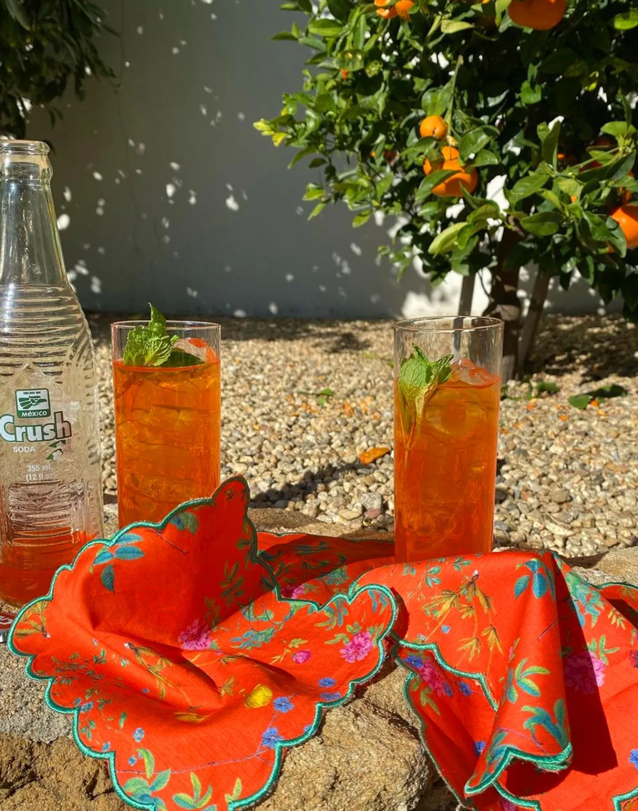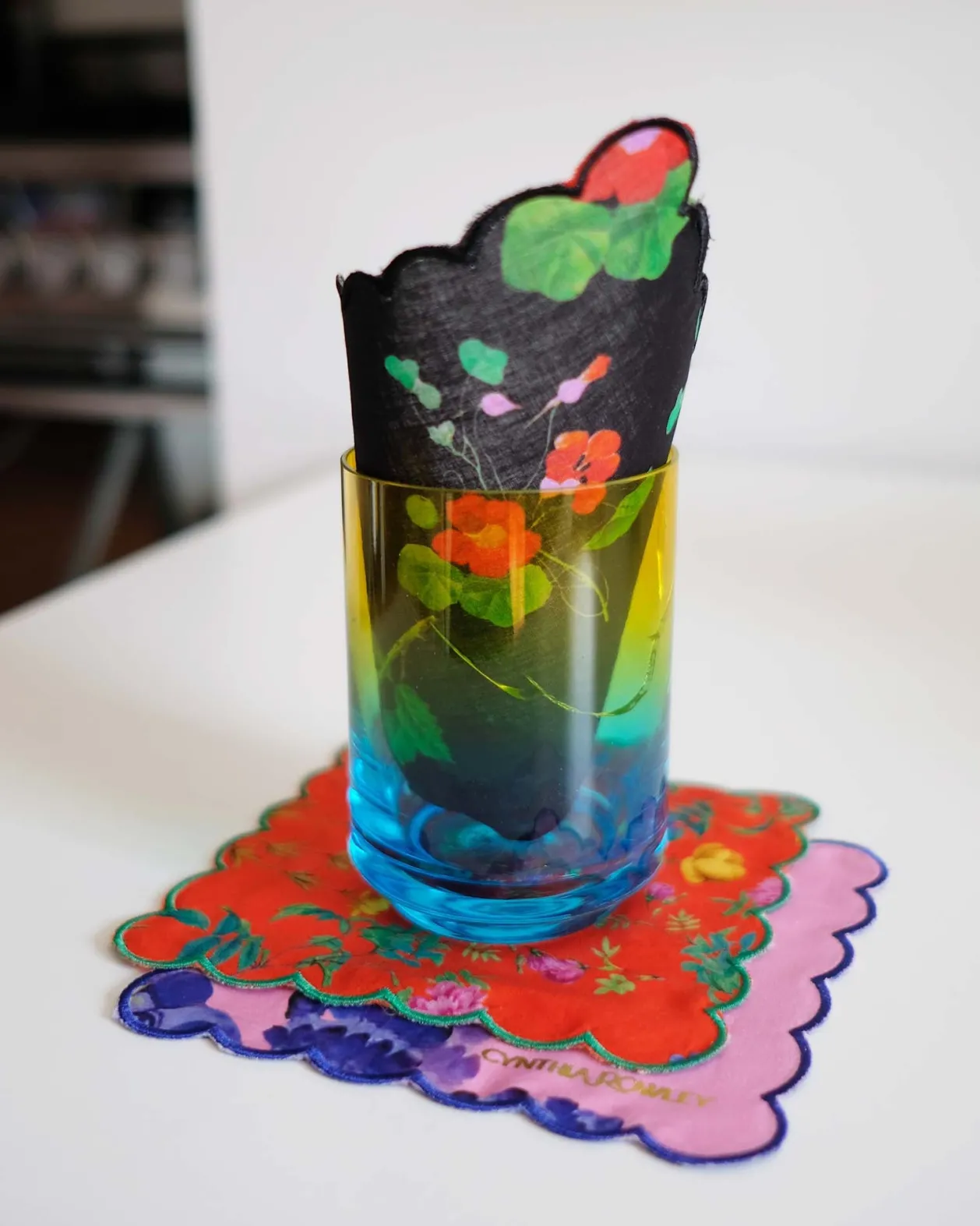 Printed cotton cocktail napkins with scallop embroidered edge. Set of four 6″ by 6″ Embroidered edge detail100% co…