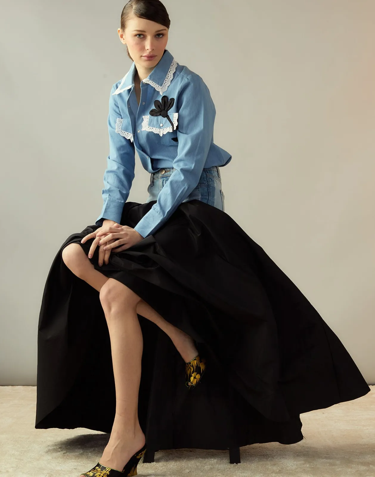 - Denim skirt with attached silk taffeta