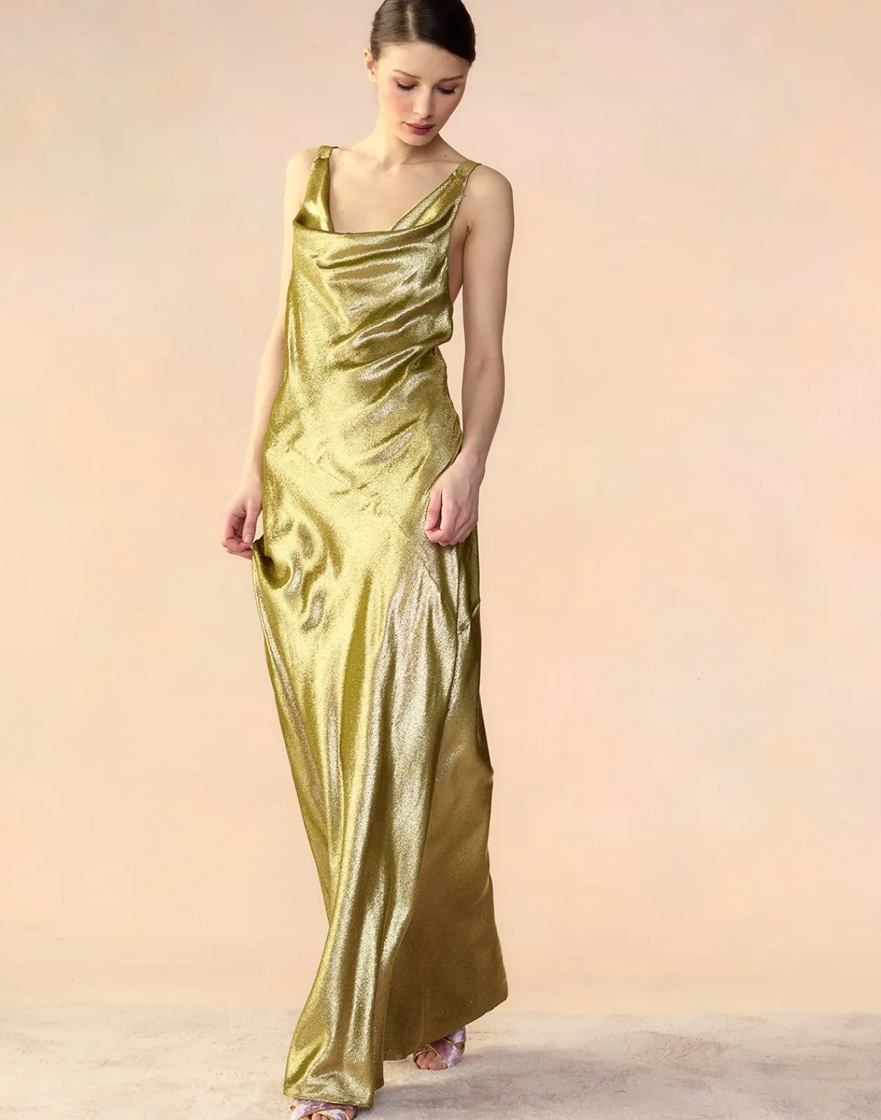 Metallic olive gold silk lamé cowl neck maxi dress.