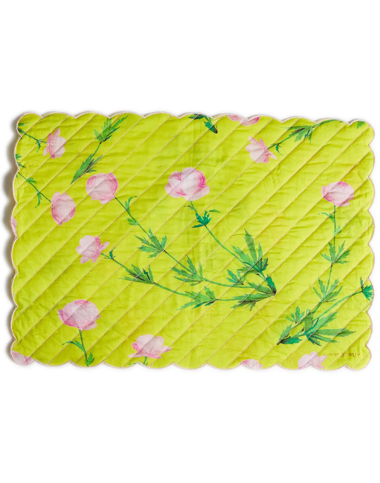 Set of 2 quilted cotton placemats. 20″ by 14″Scallop embroidered edgeGold logo detail at bottom right cornerSet of 2C…