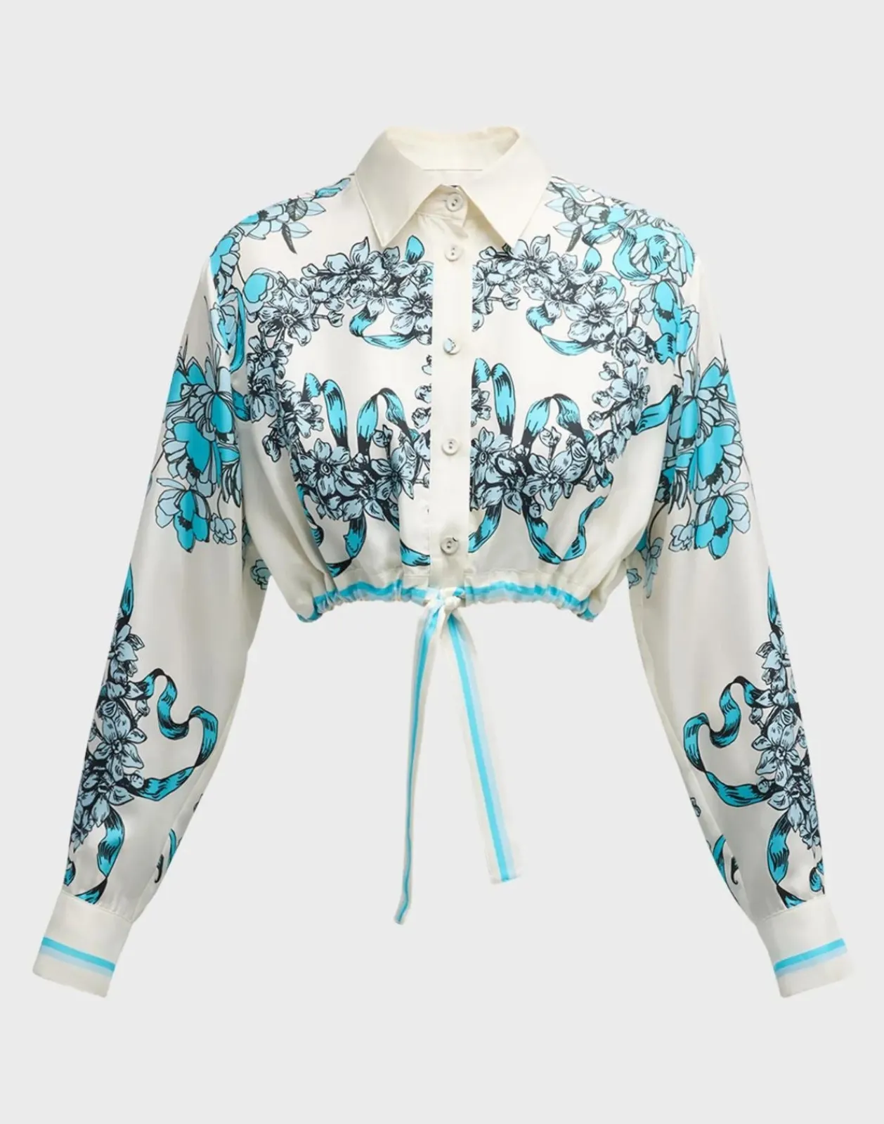 Blue & white floral ribbon silk shirt.