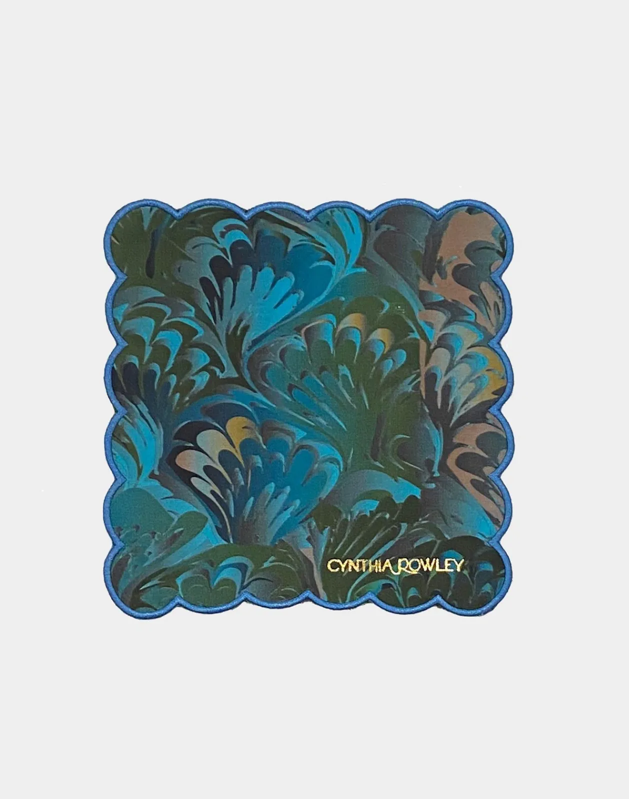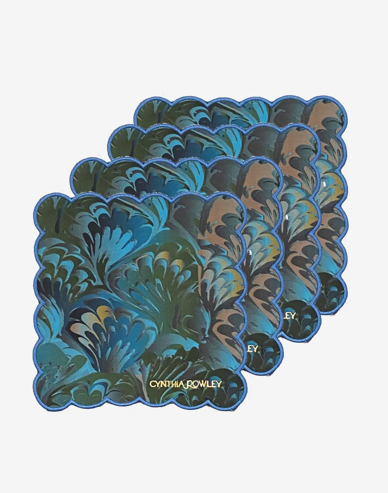 Printed cotton cocktail napkins with scallop embroidered edge.