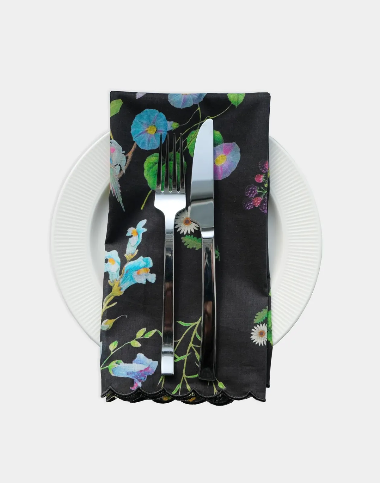 Printed cotton dinner napkins with scallop embroidered edge.