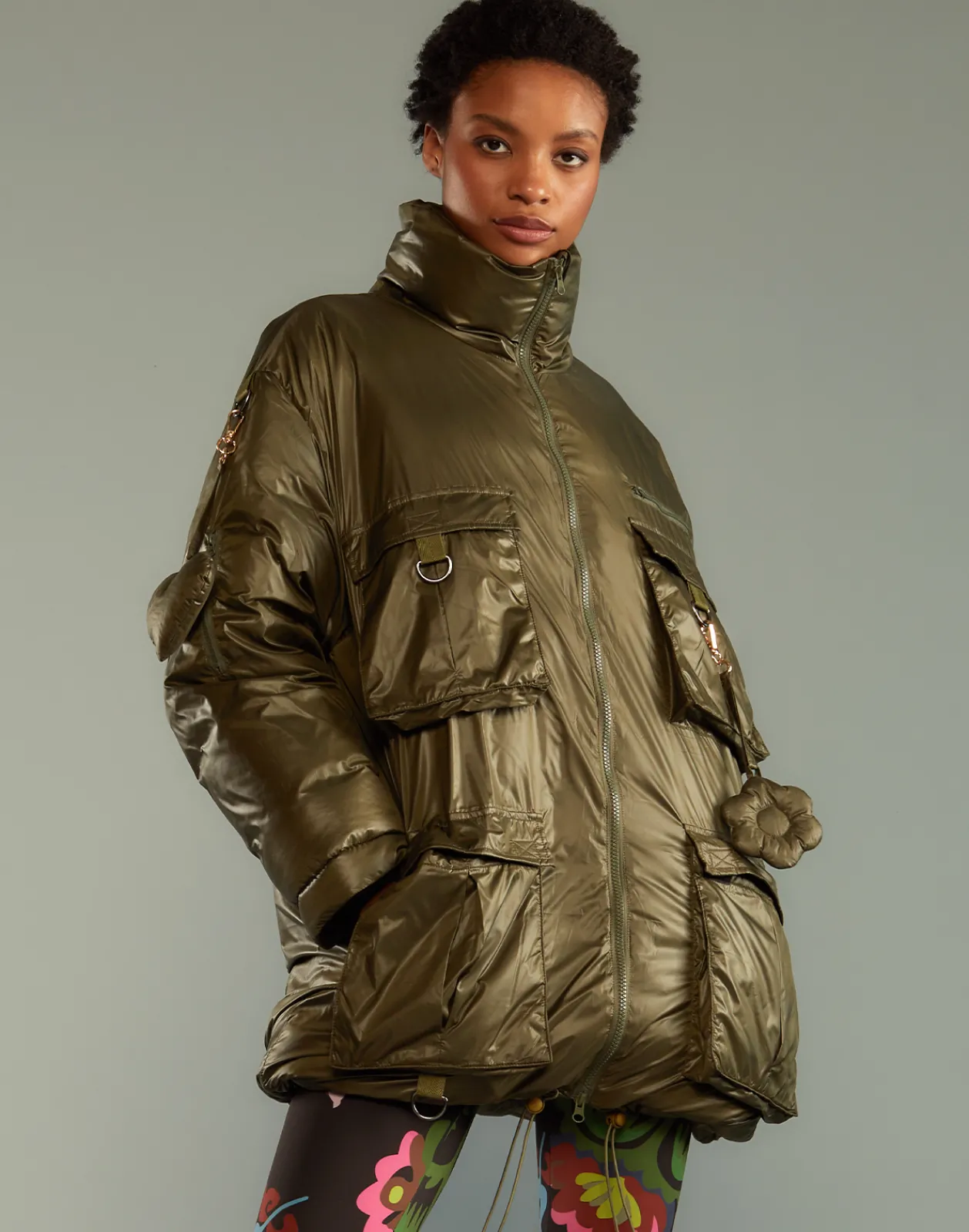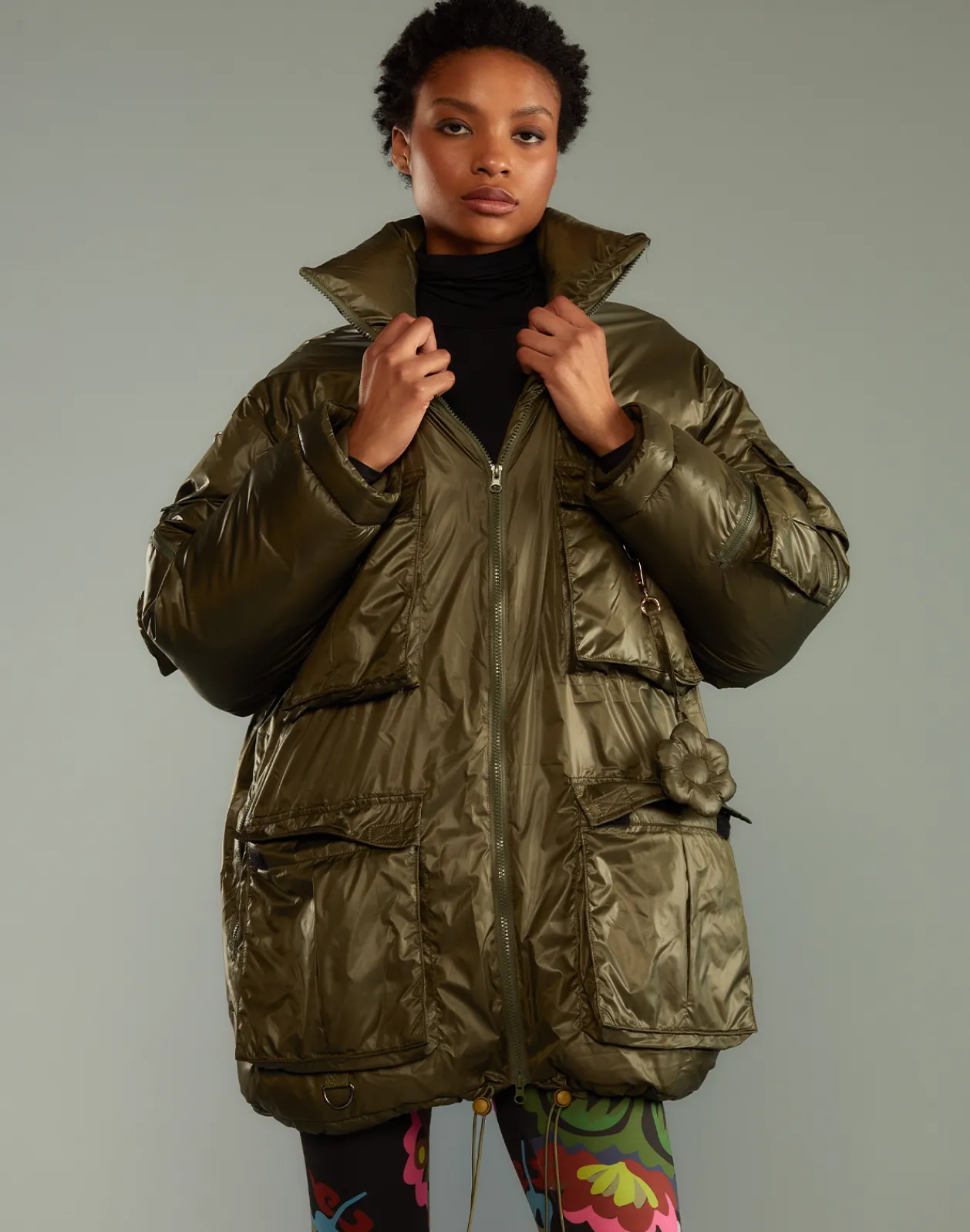 Pockets, pockets, pockets, olive green oversized down puffer coat.