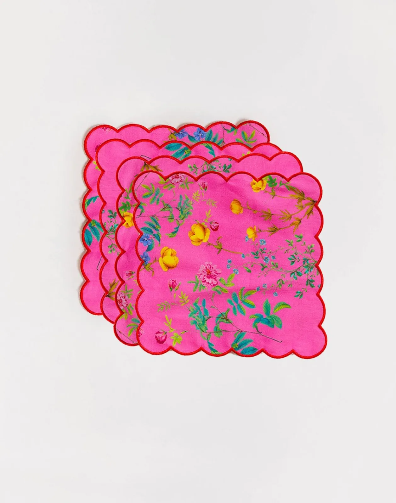 Printed cotton cocktail napkins with scallop embroidered edge.
