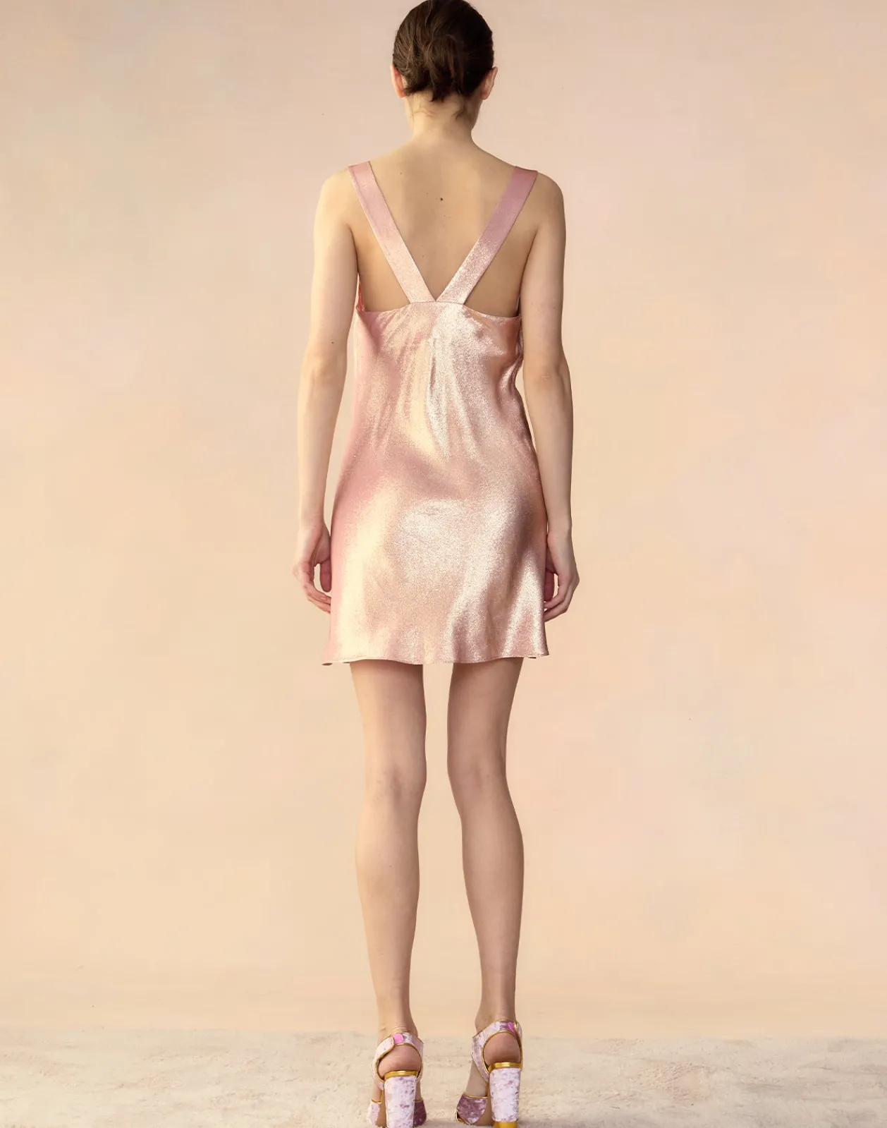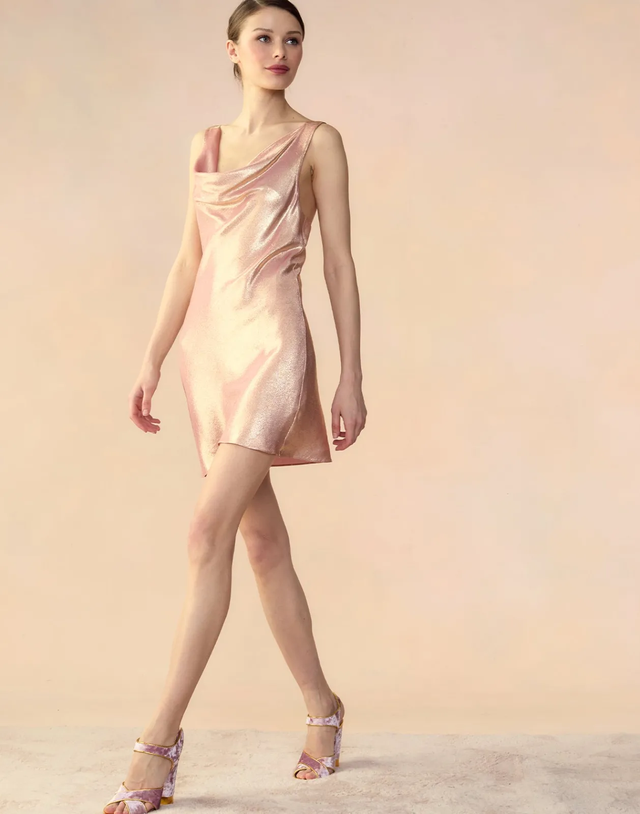 Metallic rose gold silk lamé cowl neck dress.