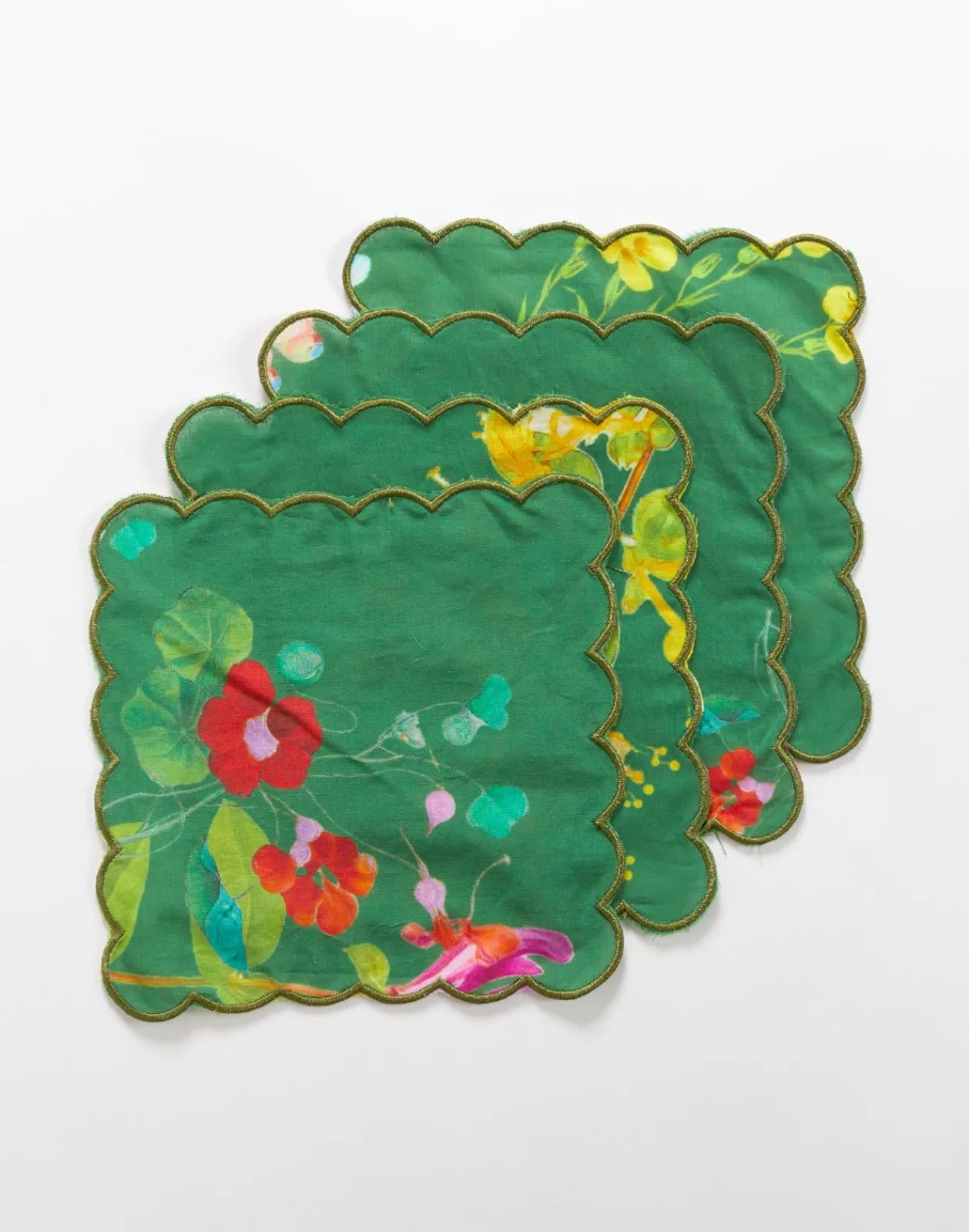 Printed cotton cocktail napkins with scallop embroidered edge.