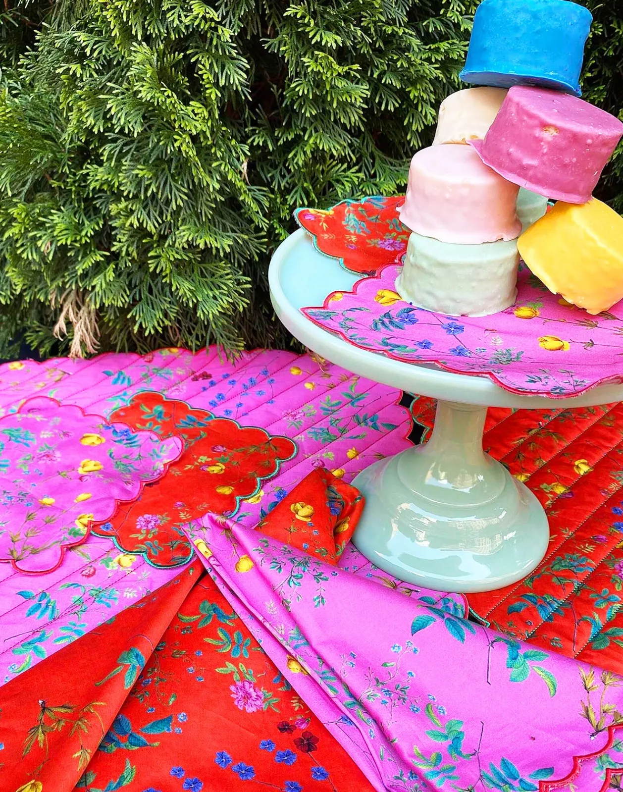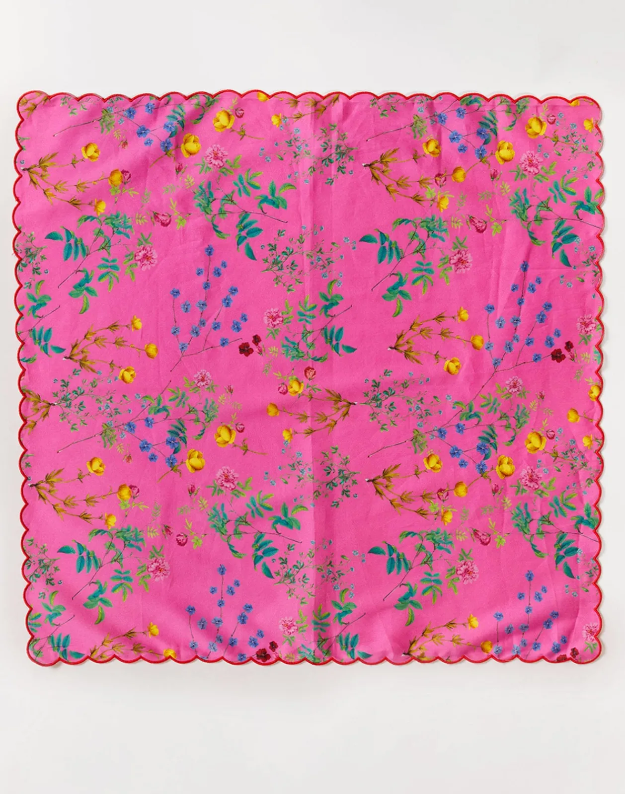 Printed cotton dinner napkins with scallop embroidered edge.
