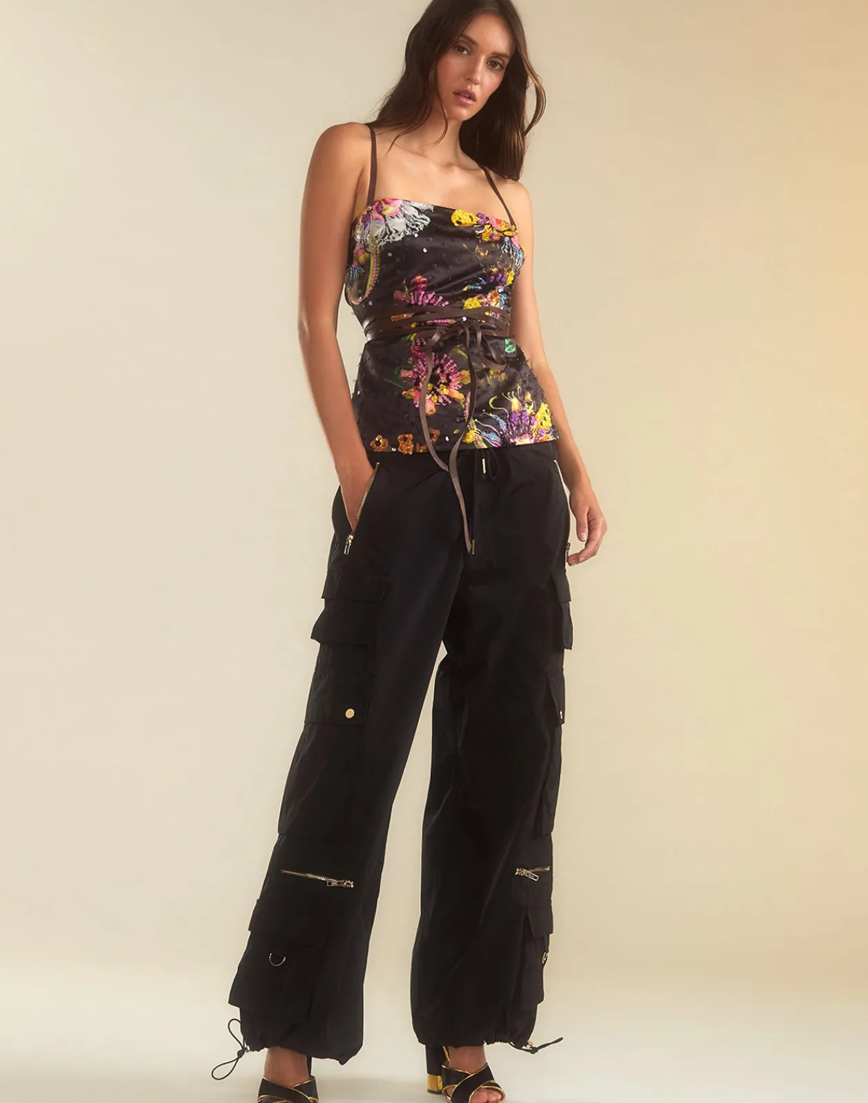 Embellished sequin leather strap tie top