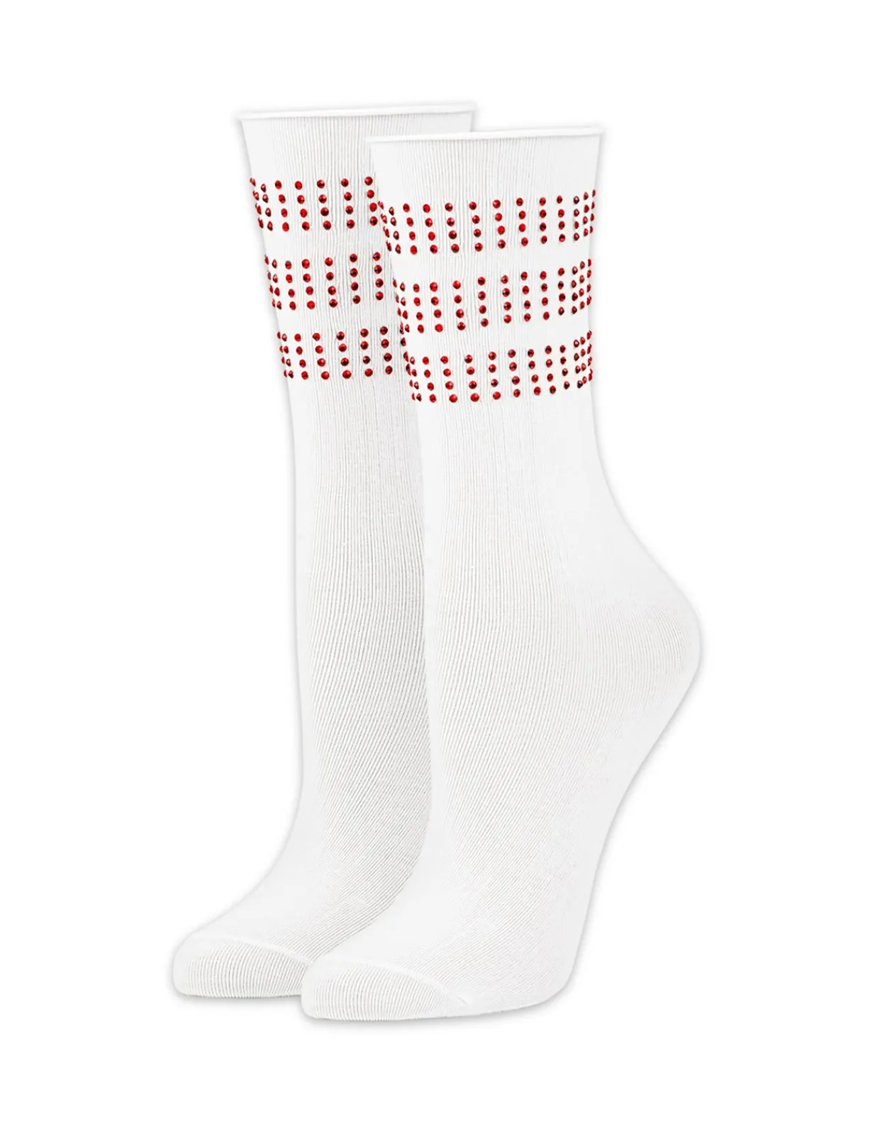 White socks with red crystals. Pair with your favorite sneakers or heels!