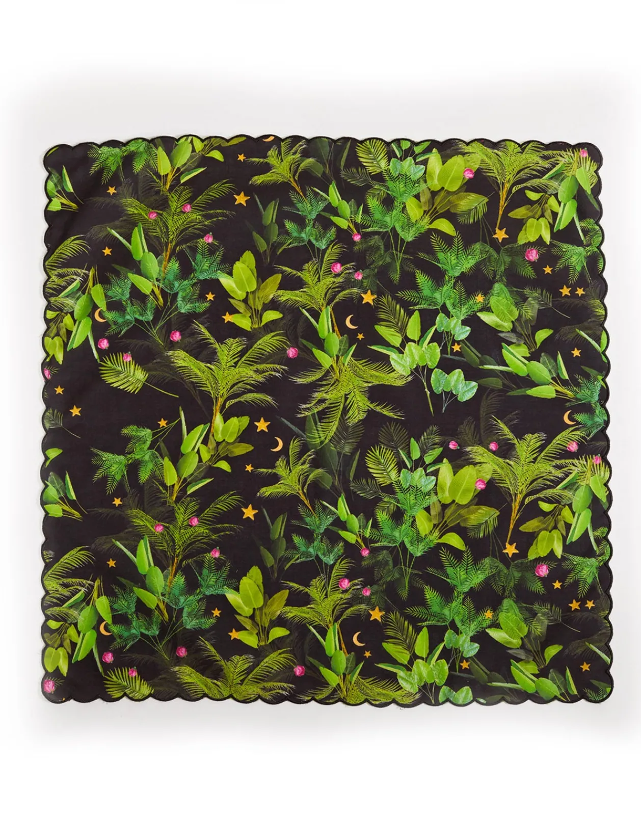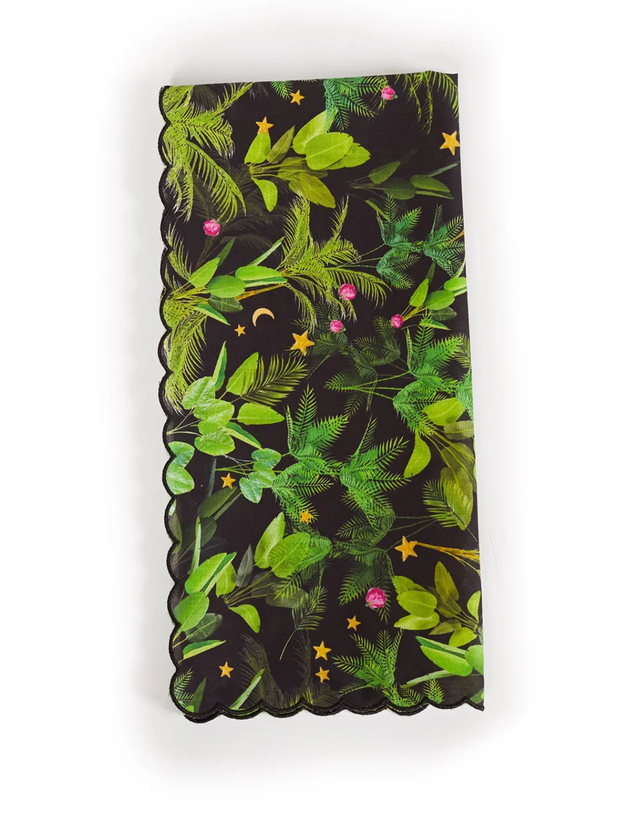 Printed cotton dinner napkins with scallop embroidered edge.