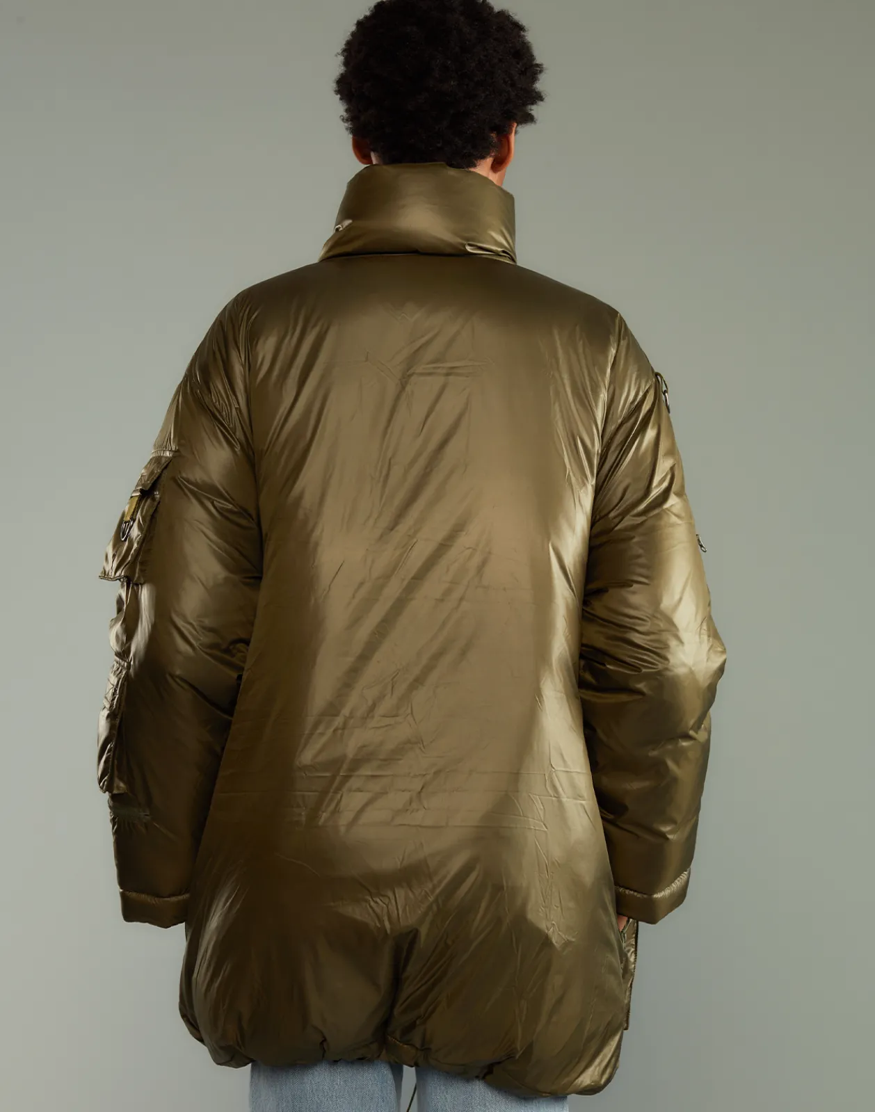 Pockets, pockets, pockets, olive green oversized down puffer coat.