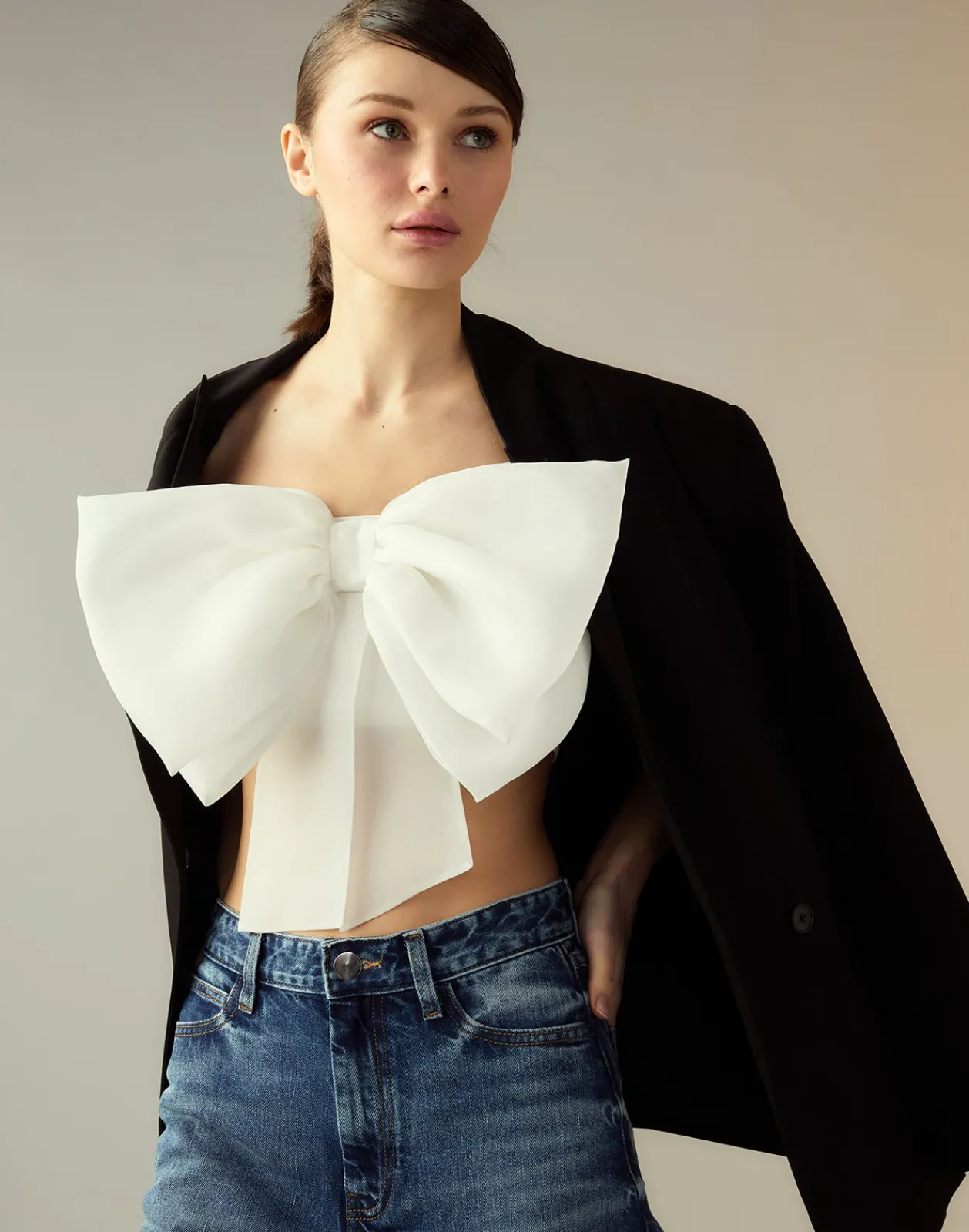 White oversized organza bow bandeau top.Oversized 3D appliqué organza bowStrapless bandeau style topFabric content: …