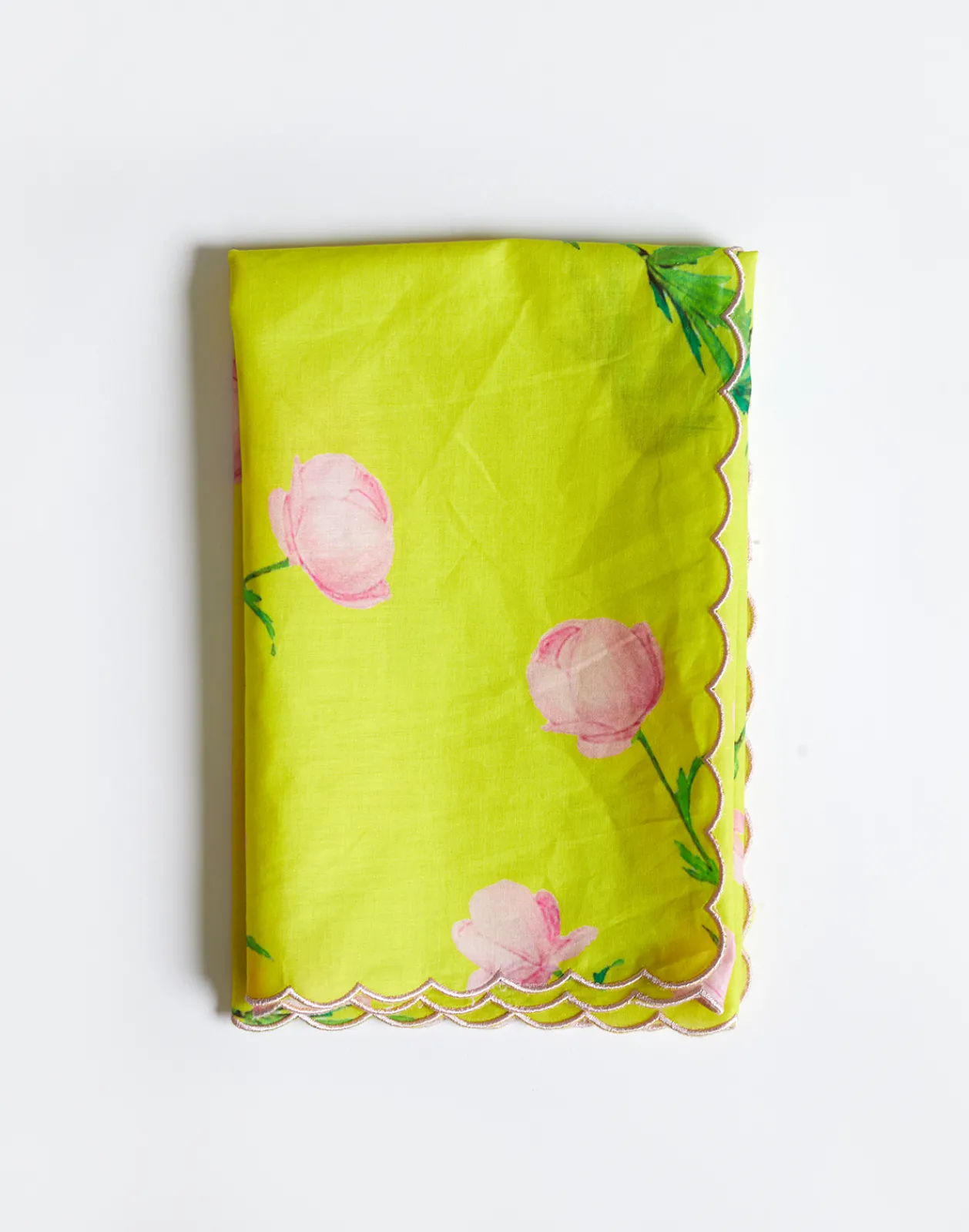 Printed cotton dinner napkins with scallop embroidered edge. Set of four 20″ by 20″ Embroidered edge detail100% cotto…