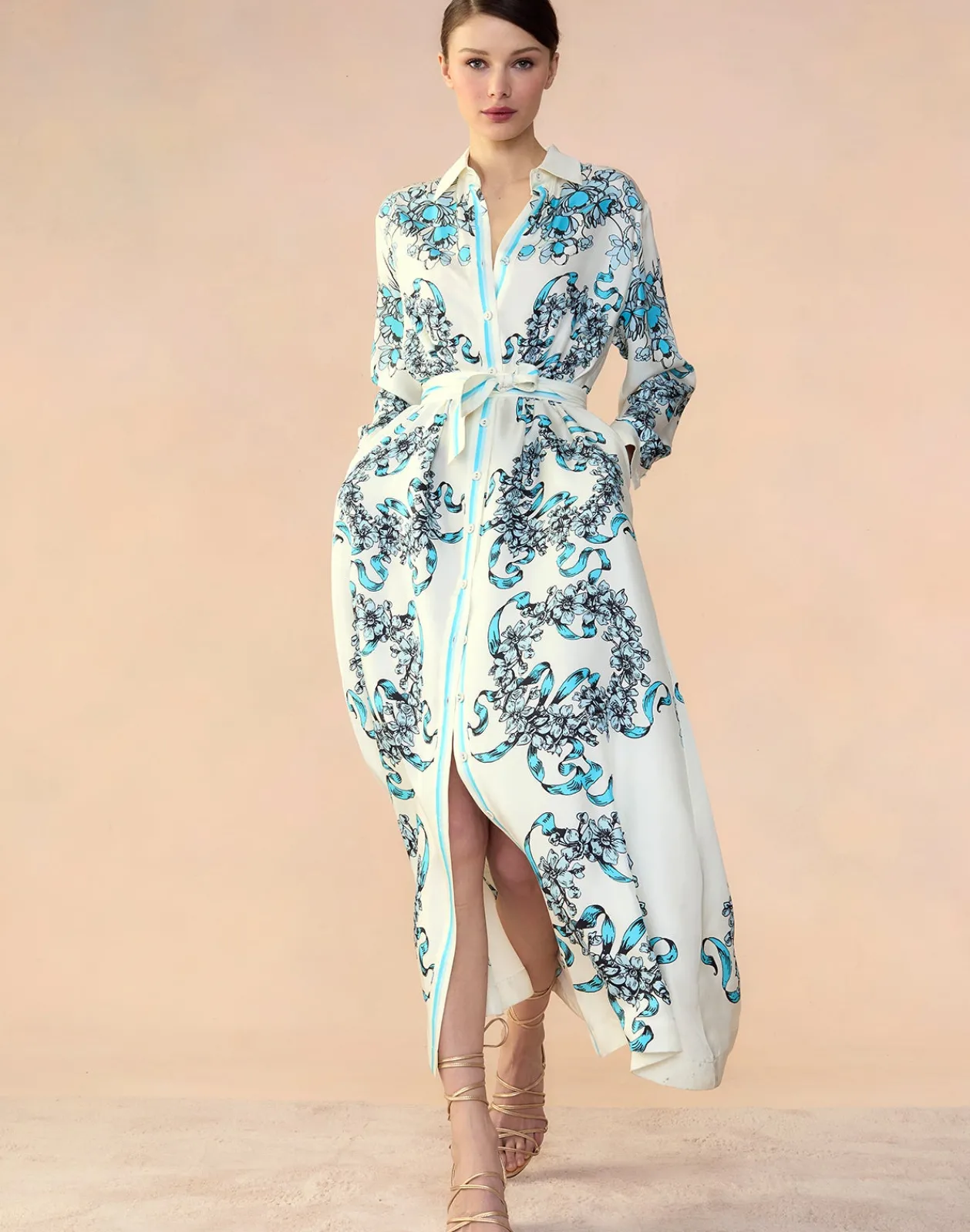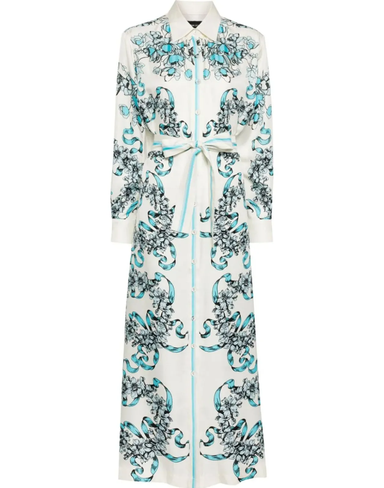 Blue & white floral ribbon silk shirt dress.
